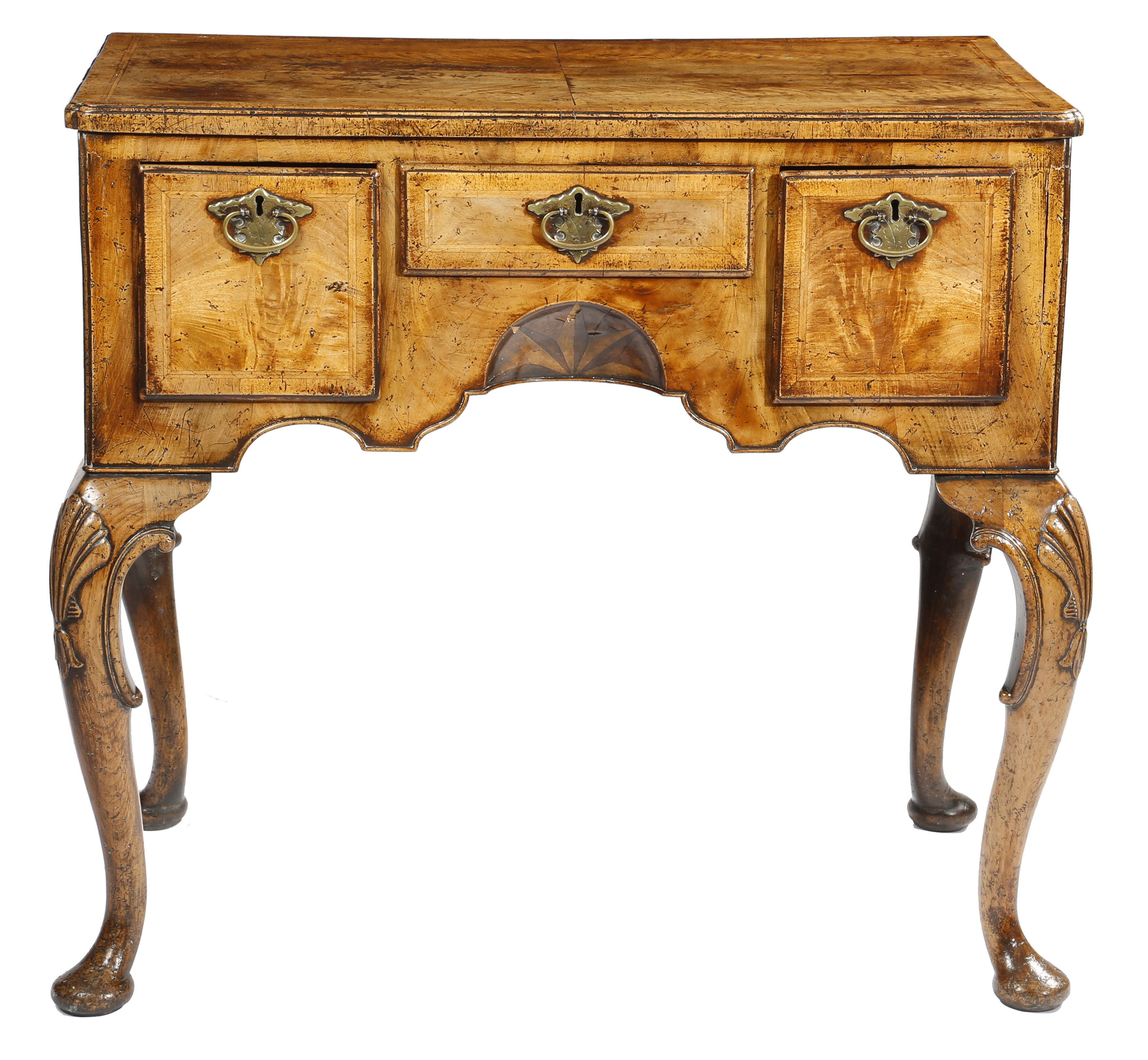 A walnut lowboy in George II style, the quarter veneered top with cross and feather banding, above three conforming frieze drawers and a shaped apron with a concave parquetry sunburst, on shell capped cabriole legs and pad feet, 72.7cm high, 81cm wide, 48.3cm deep.