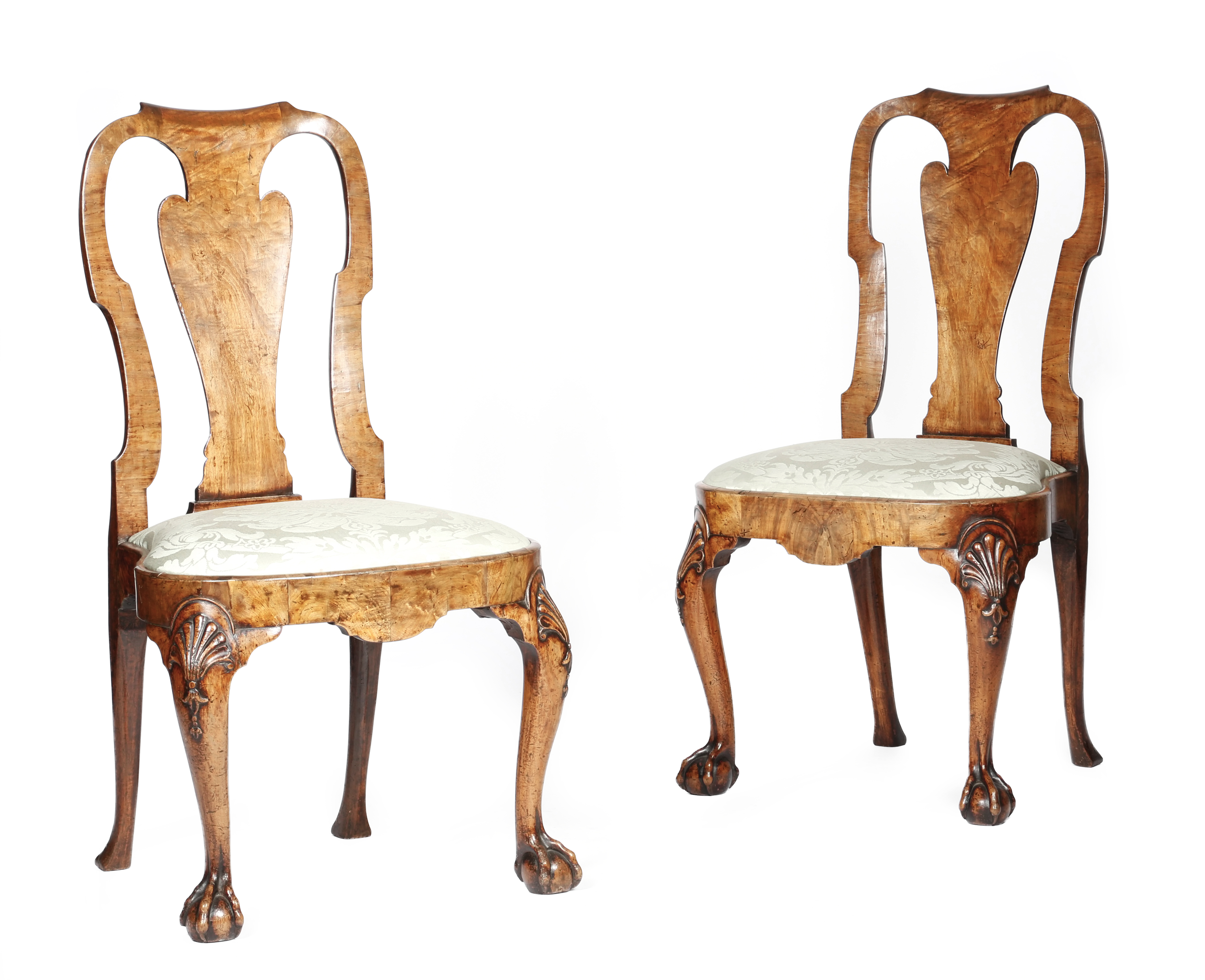 A pair of George II walnut side chairs, each with a solid vase shape splat, above a bell shape drop-in seat later upholstered in damask fabric, on shell capped cabriole legs and claw and ball feet. (2)