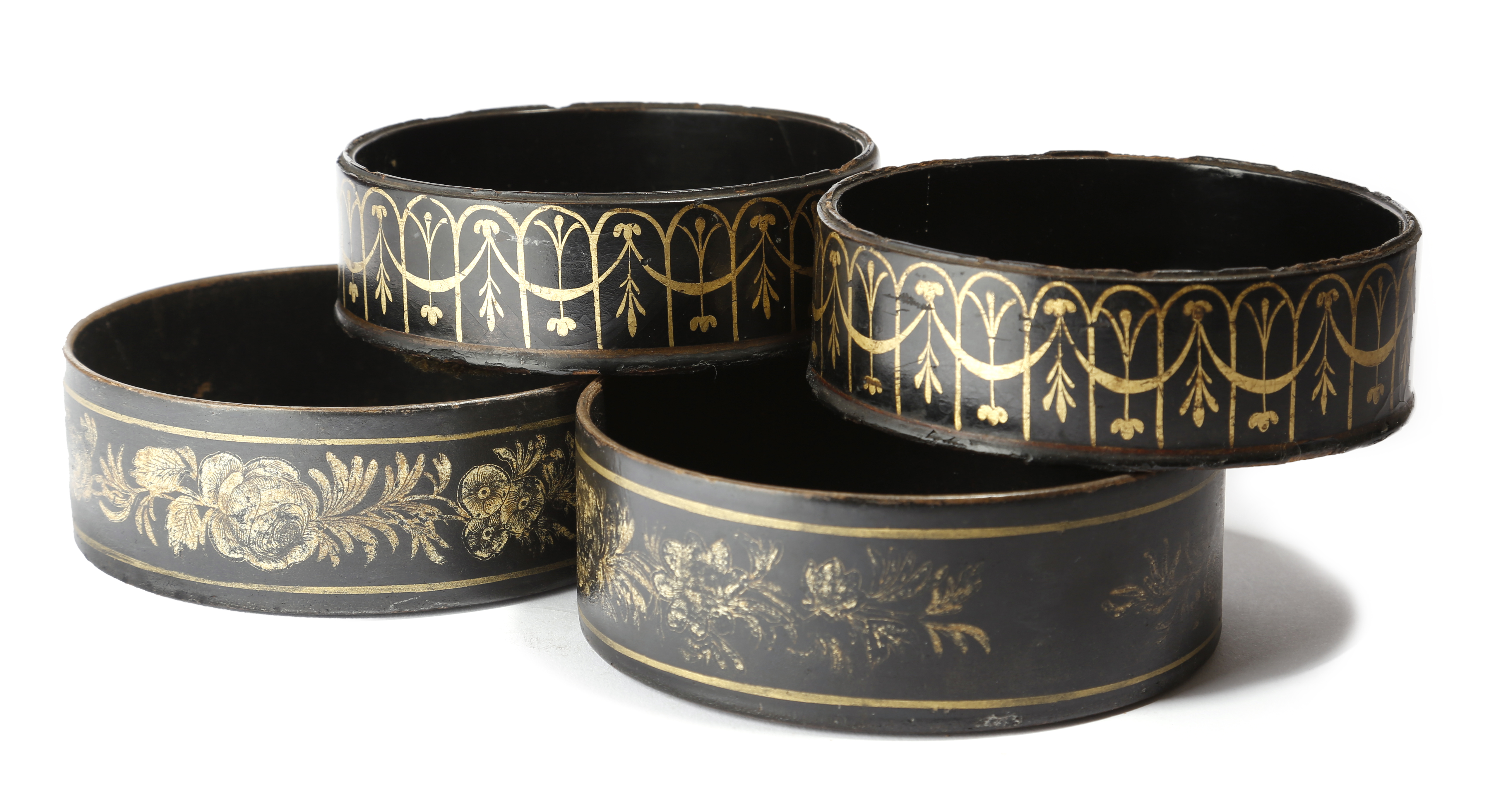 Two pairs of Regency papier-mâché wine coasters, one decorated with flowers, the other in gilt with swags, 13.5cm diameter (max). (4)