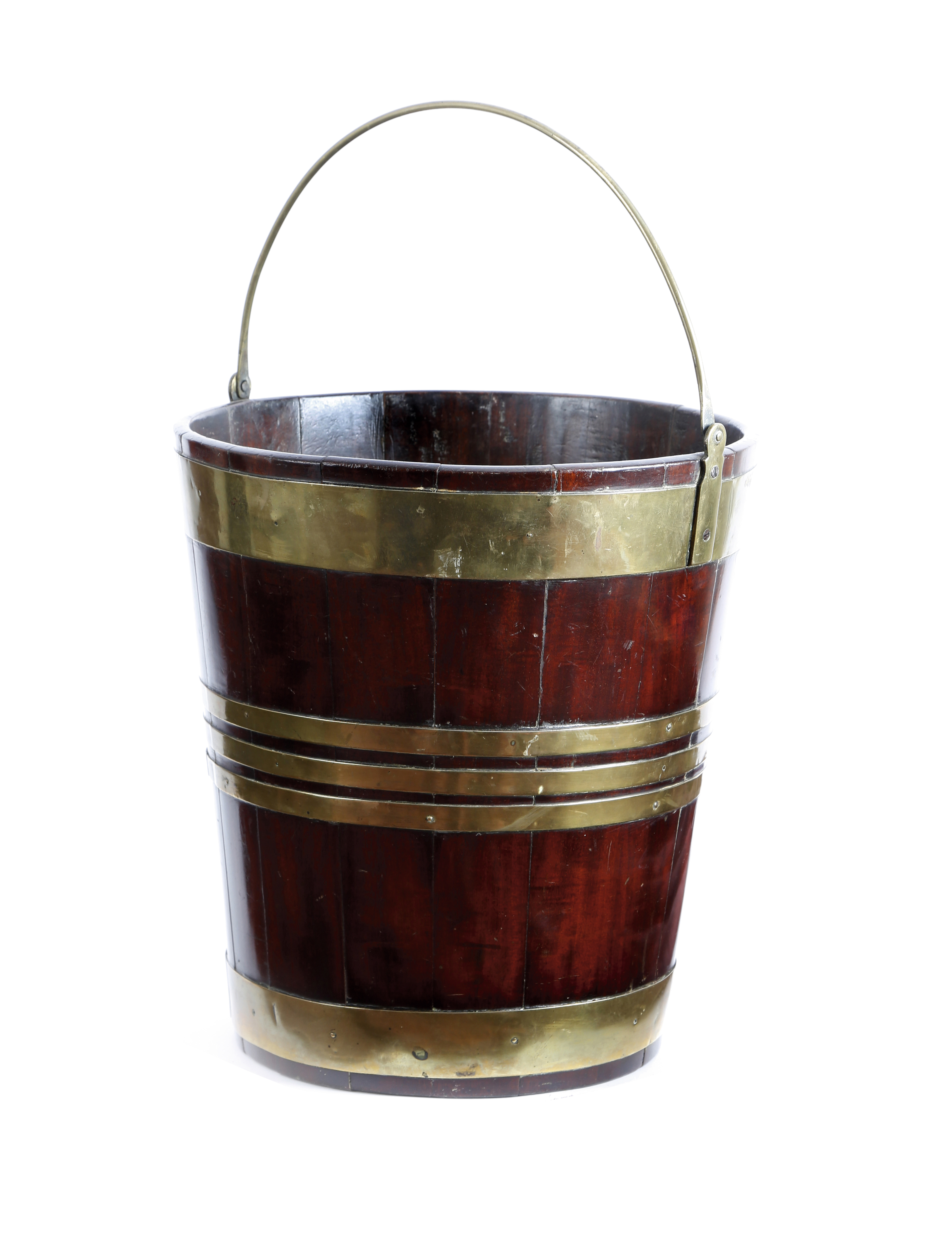 A late George III mahogany and brass bound peat bucket, of staved construction, with a swing handle, 35cm high, 32.5cm diameter.