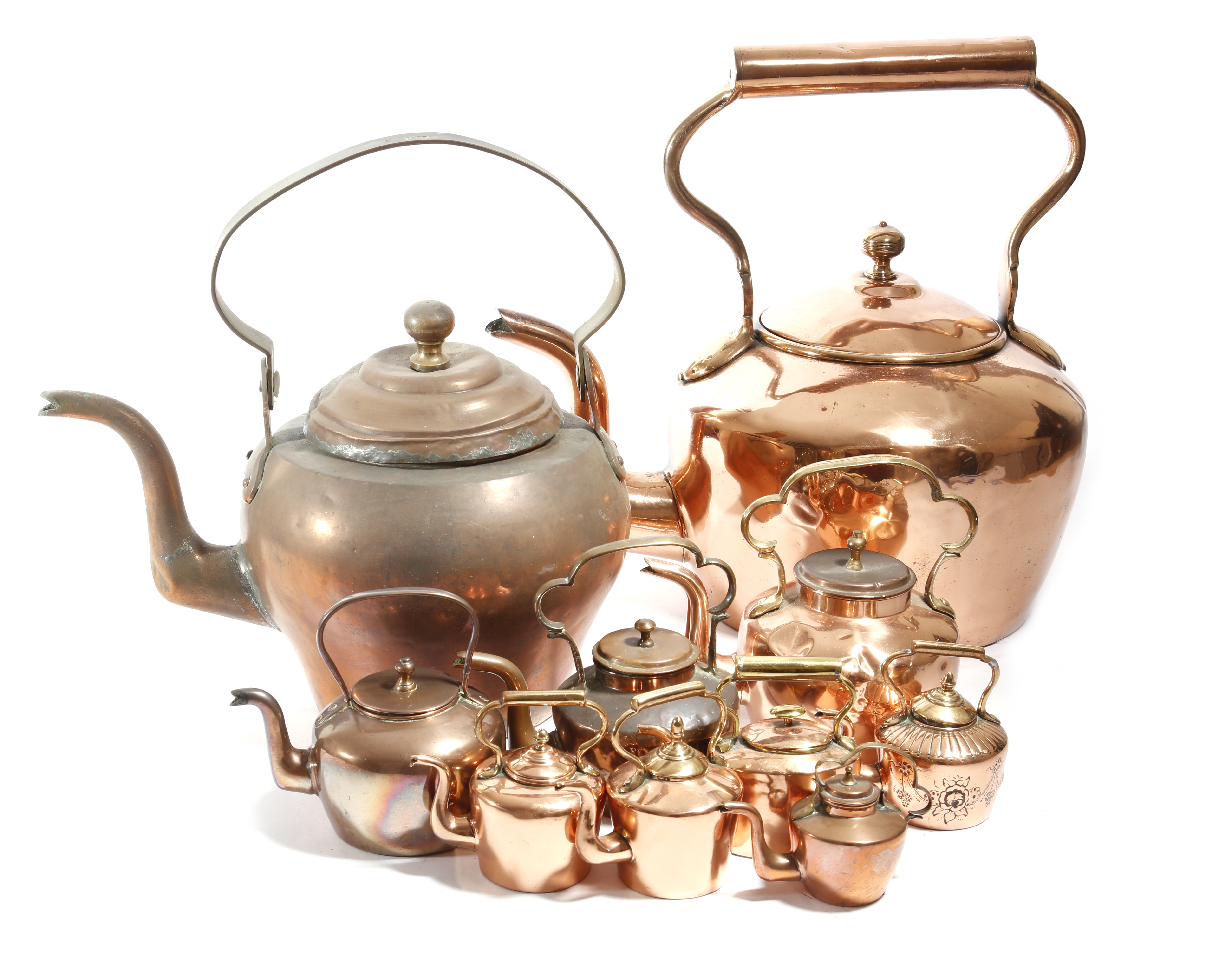 Ten copper kettles, some with brass handles, one with repousse decoration, of various sizes, 19th century and later, 40.2cm (max). (10)