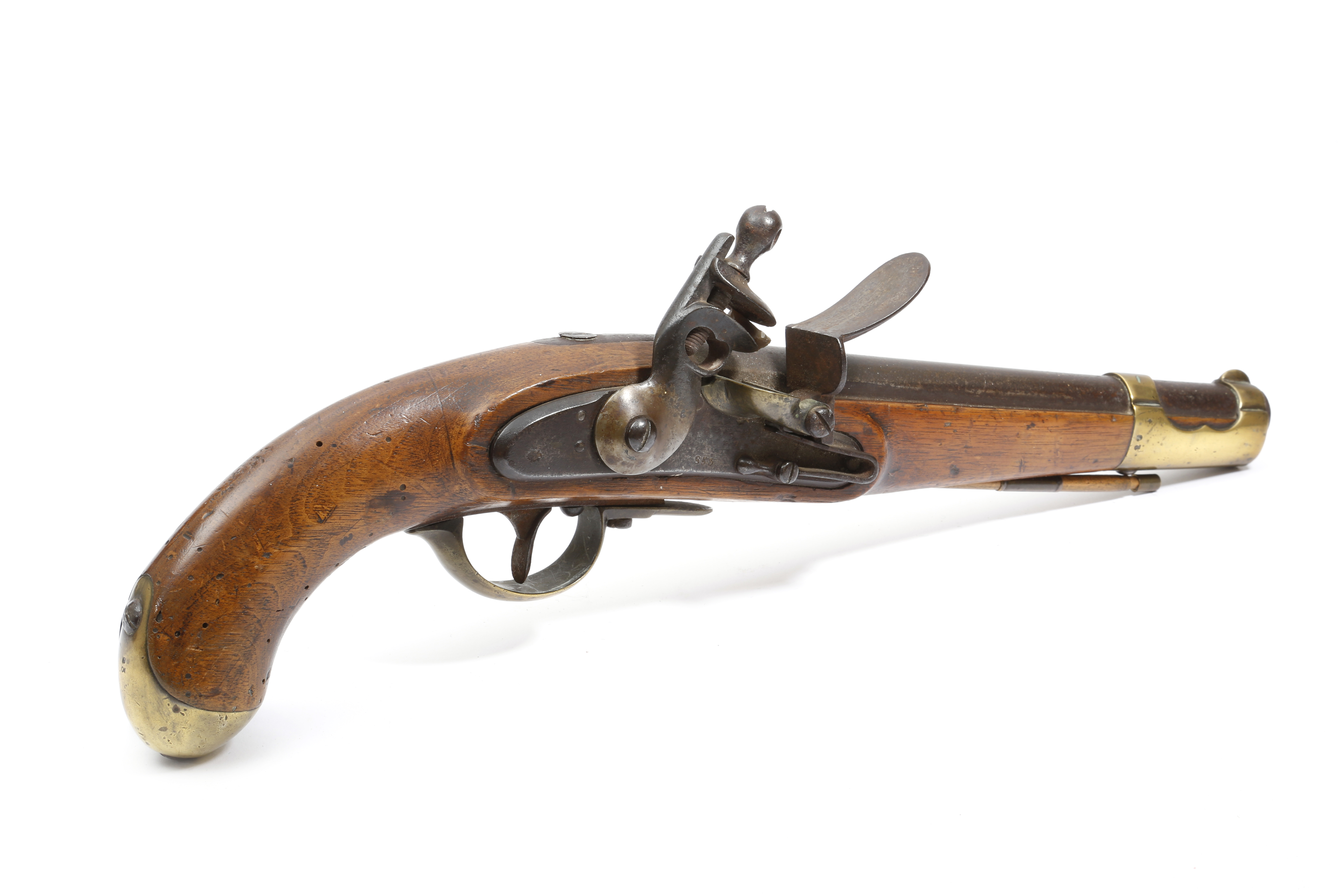 A continental military walnut and brass mounted flintlock pistol, stamped with various numbers, late 18th / early 19th century, 43.5cm long.