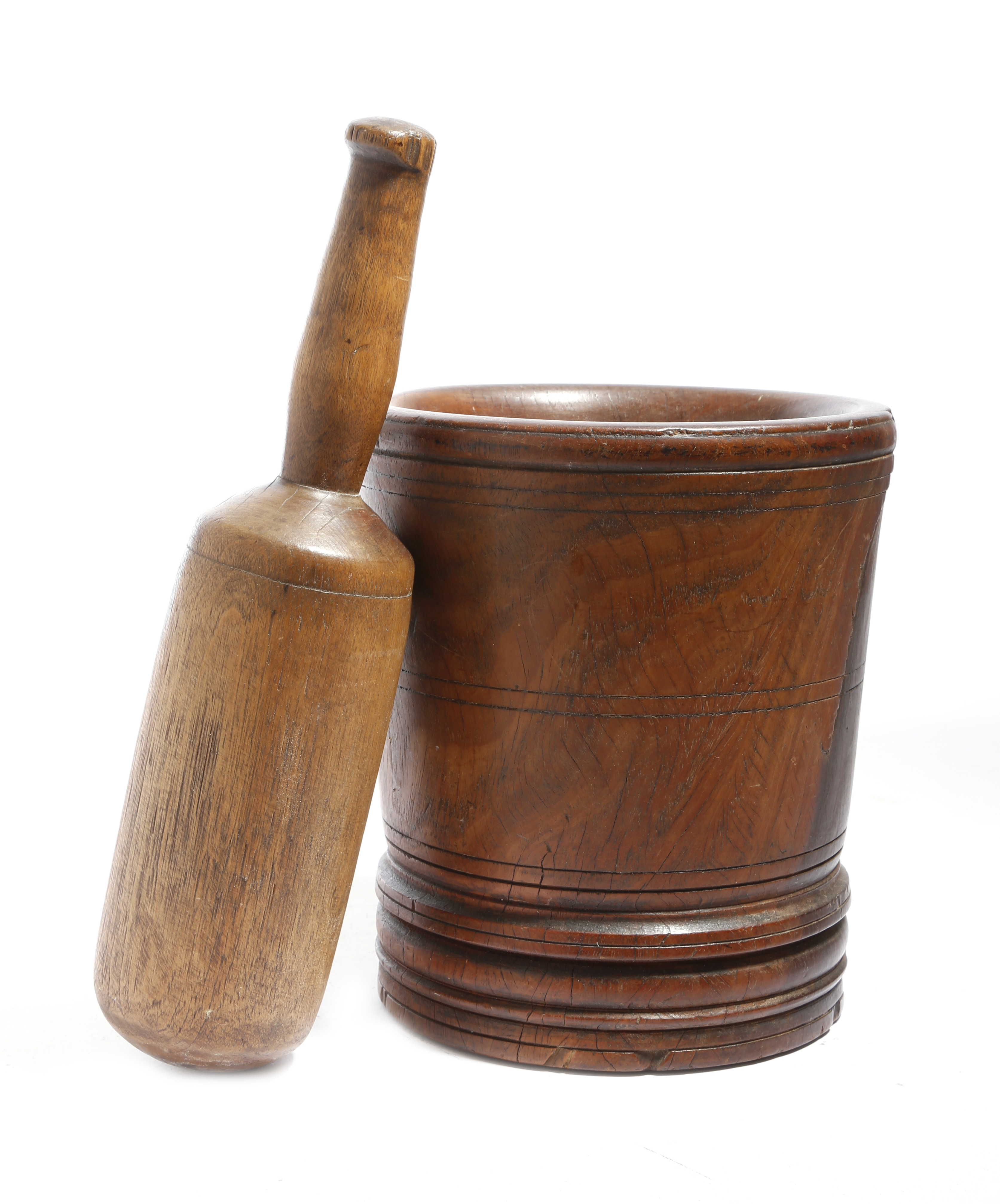 An 18th century turned lignum vitae mortar, with reeded bands, 18.7cm high, together with an associated pestle. (2)