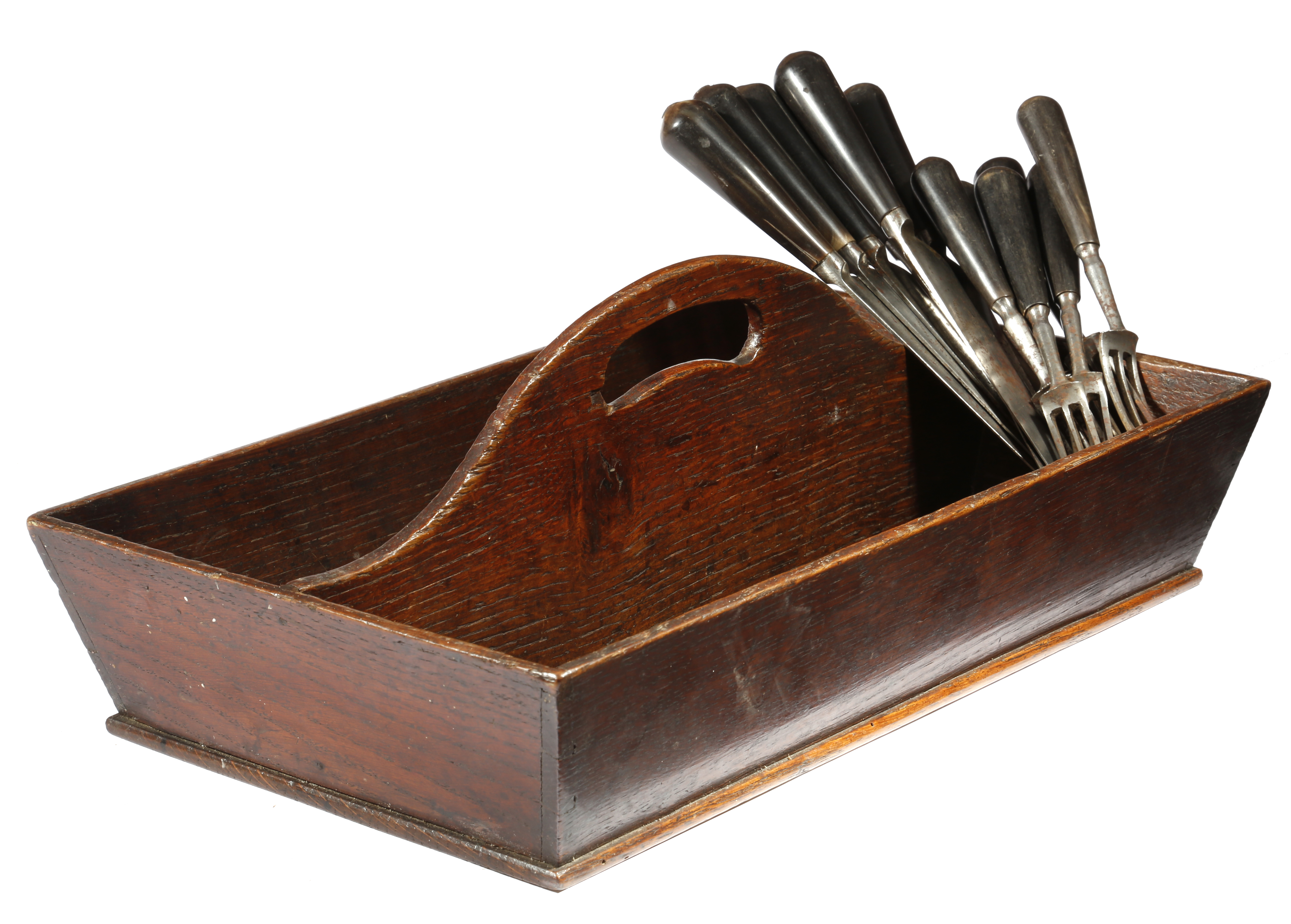 An early 19th century oak cutlery tray, with two divisions and pierced with a handgrip, 36.5cm wide, together with a set of six 19th century steel knives and forks with horn handles, the blades stamped 'S. HERRIOTT & SONS SHEFFIELD'. (13)