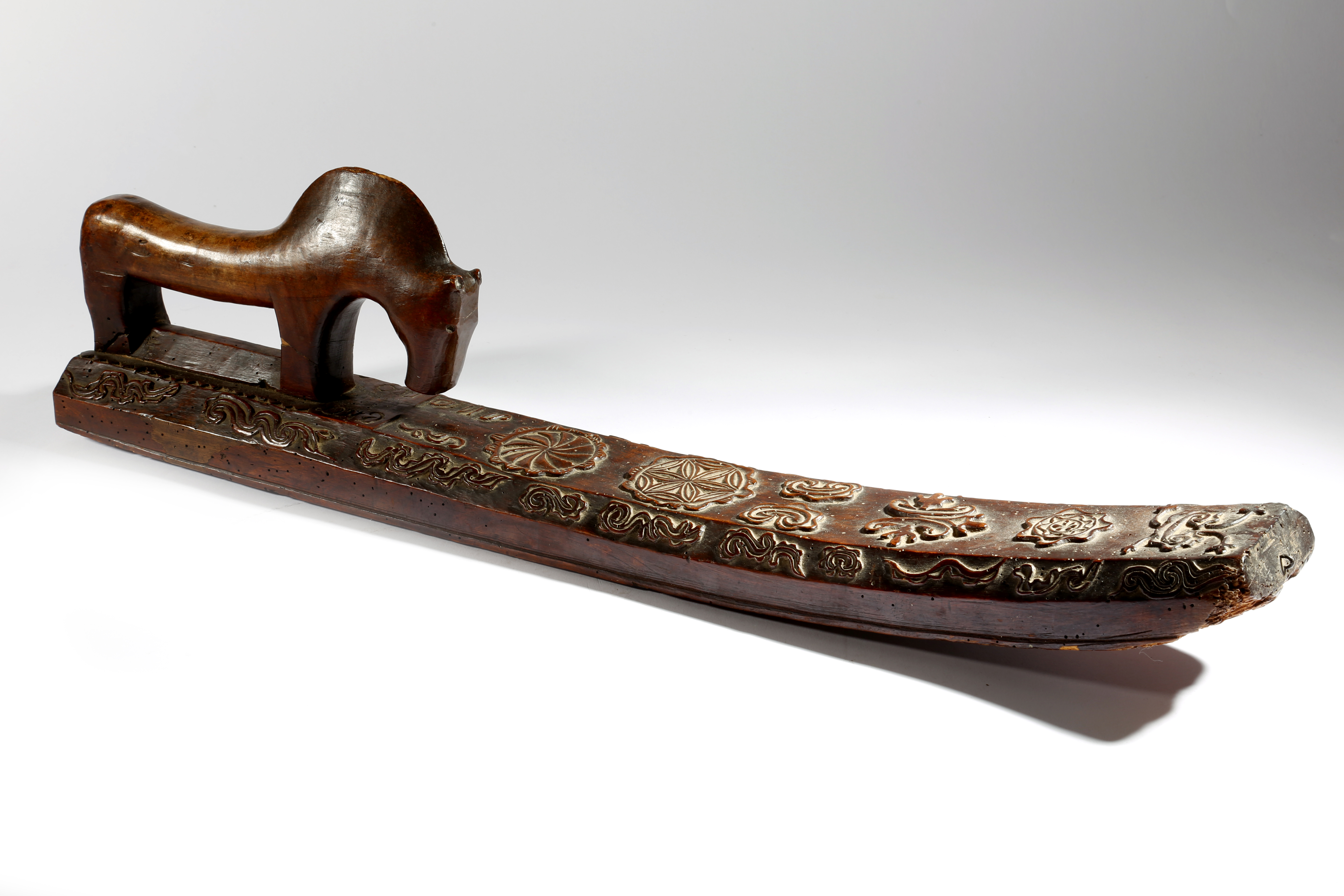 An 18th century Scandinavian treen birch mangle board, with a stylised horse handle and carved with foliage and whorls, inscribed 'Ano' and intitals 'E H O', with the date '1700', 71cm long.