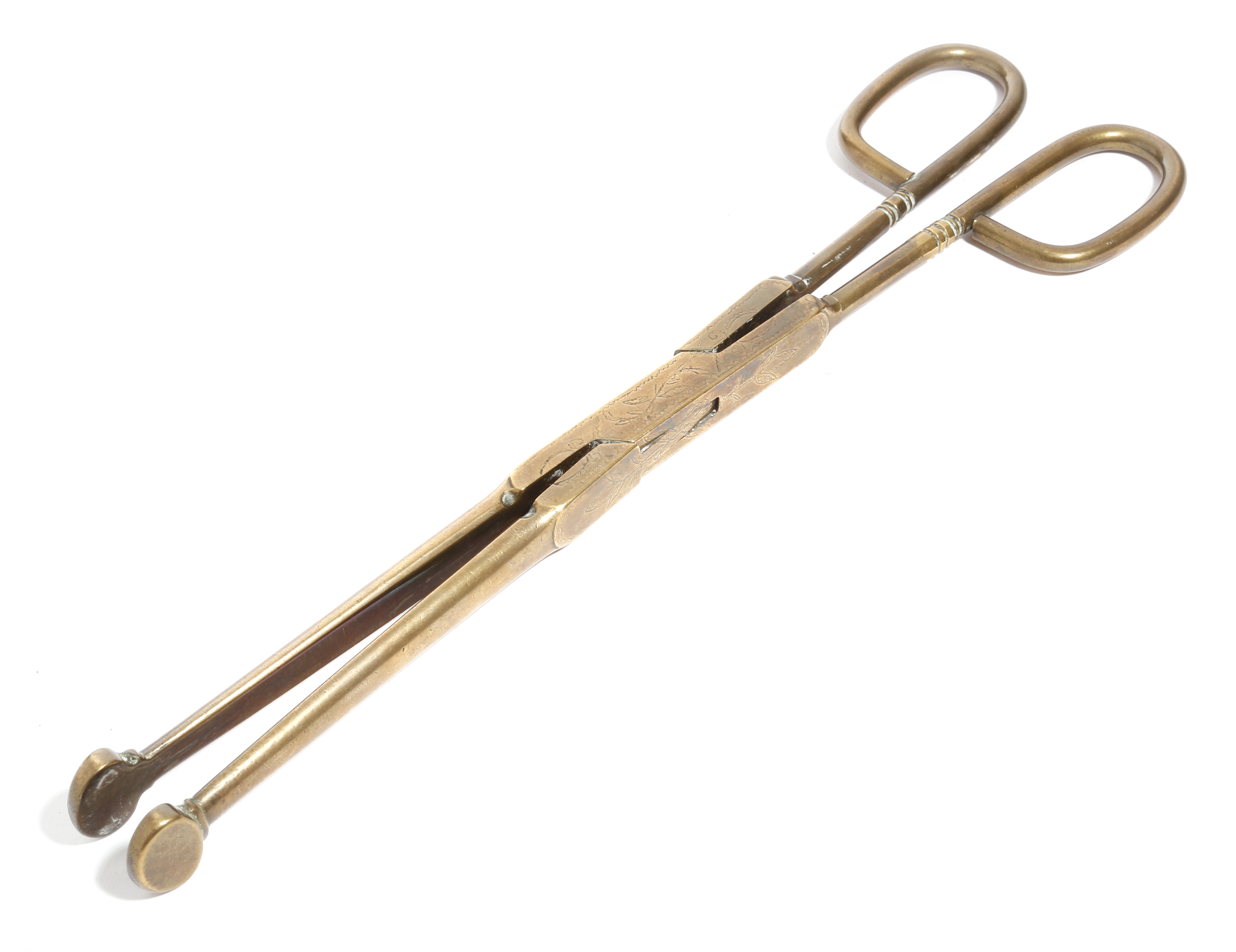 A pair of 18th century bronze ember tongs, engraved with flowers, 33.9cm long.