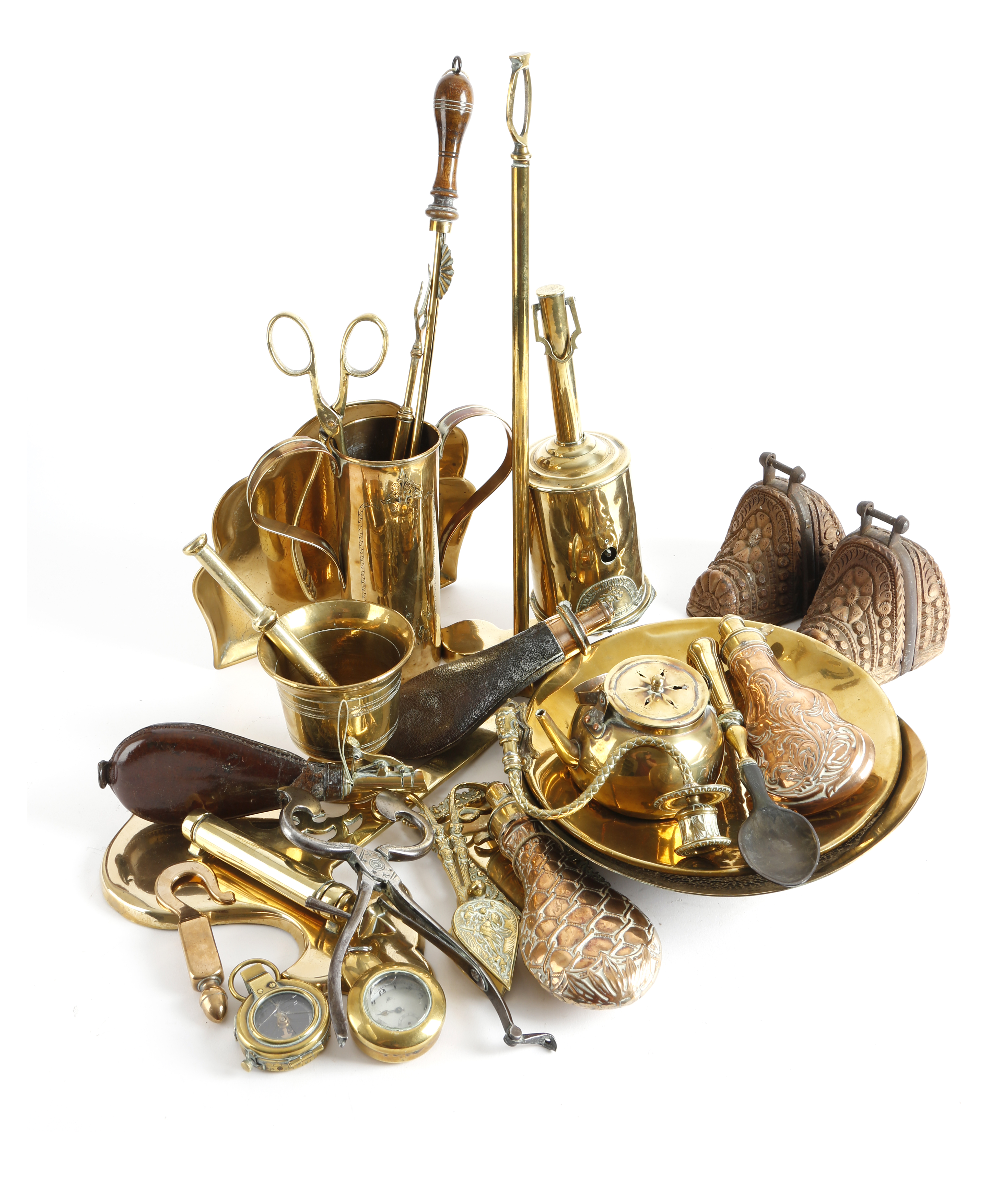 A collection of brass and other items, including: a spoon with a horn bowl, a pair of candle snuffers with repoussé decoration, a mortar and pestle, hanging scales by John Linwood, a wall bracket, four powder flasks, a pair of George III steel sugar cutters and a pair of tethers. (26)