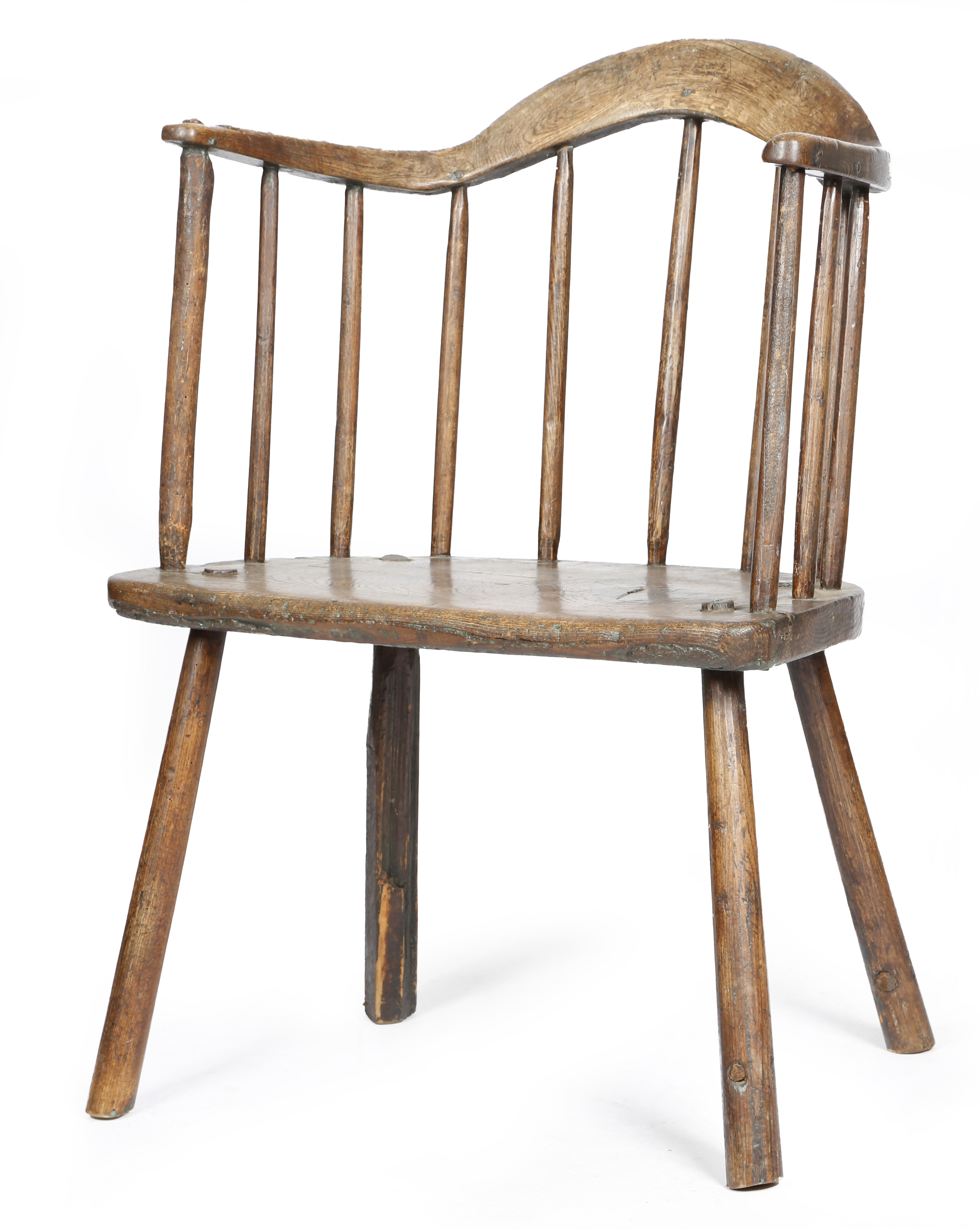 An early 19th century primitive ash stick-back armchair, with a bow top rail above an elm seat, on turned front legs, possibly Welsh.