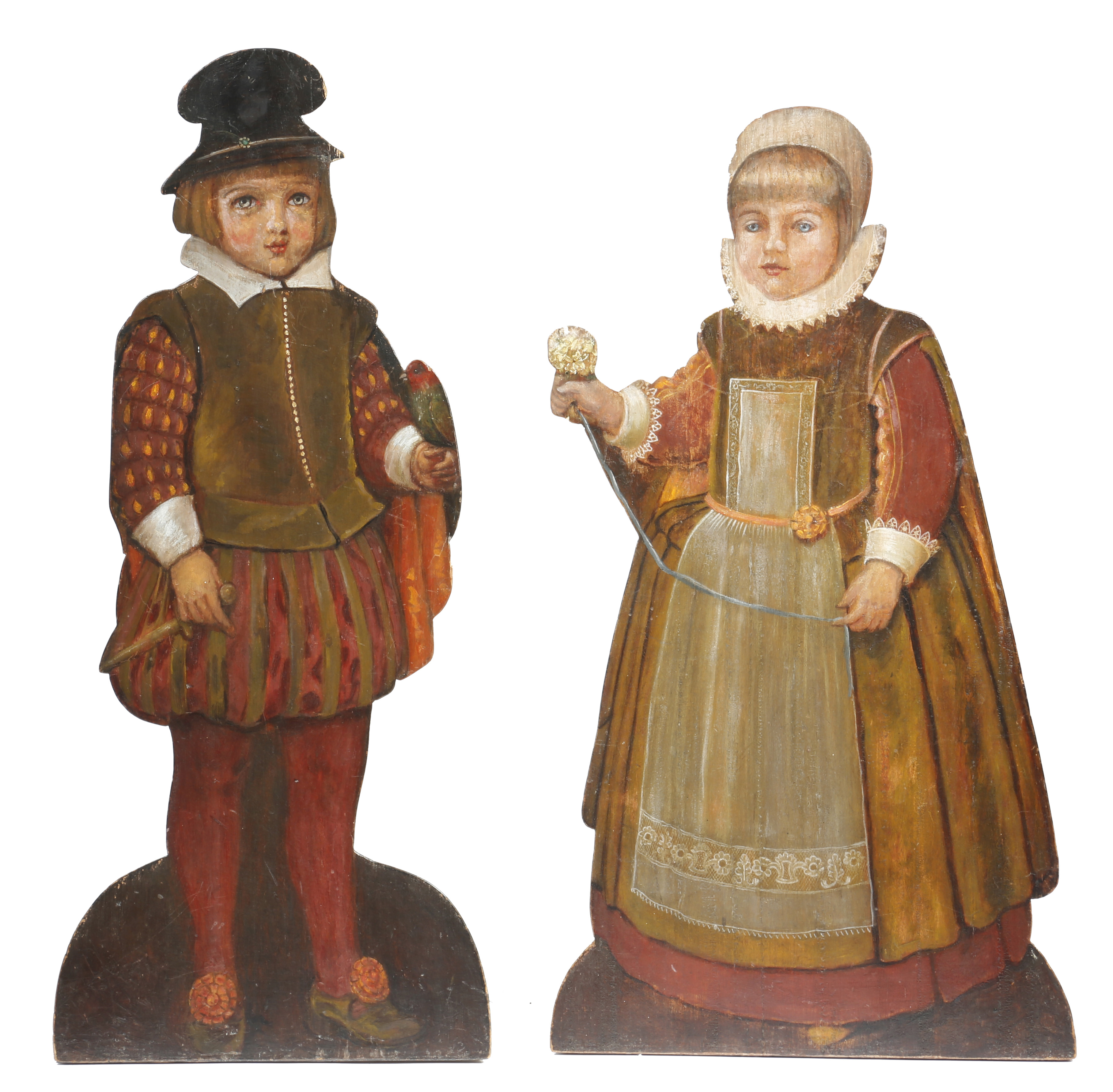 A pair of painted wood dummy board figures, of an Elizabethan boy and girl, each with a hinged easel support and a brass suspension ring, late 19th / early 20th century, 83.5cm high, 42.8cm wide. (max). (2)