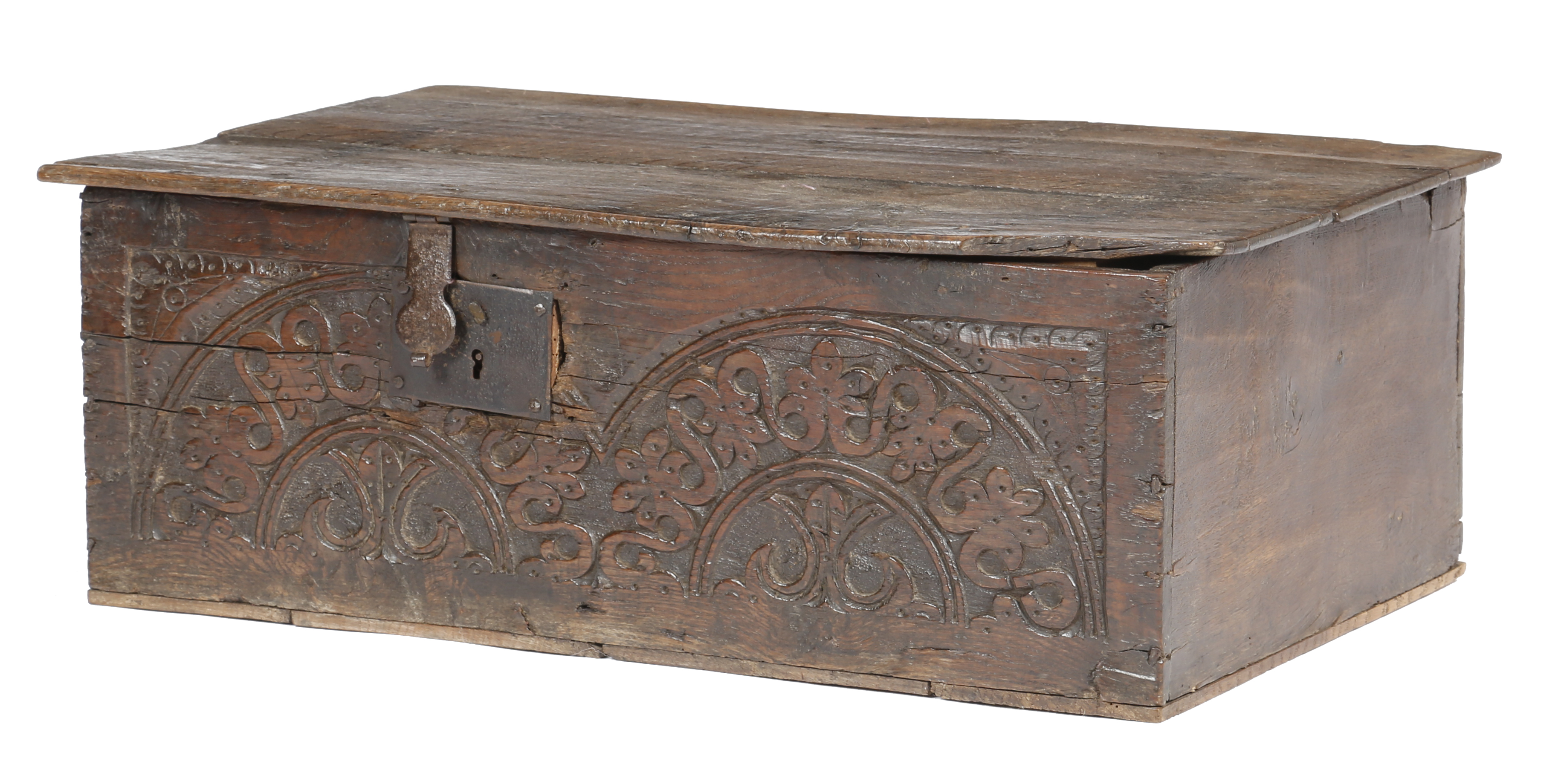 A mid-17th century West Country oak bible box, the boarded hinged top above a foliate carved lunette front, possibly Exeter, 25.8cm high, 72.2cm wide, 43.6cm deep.