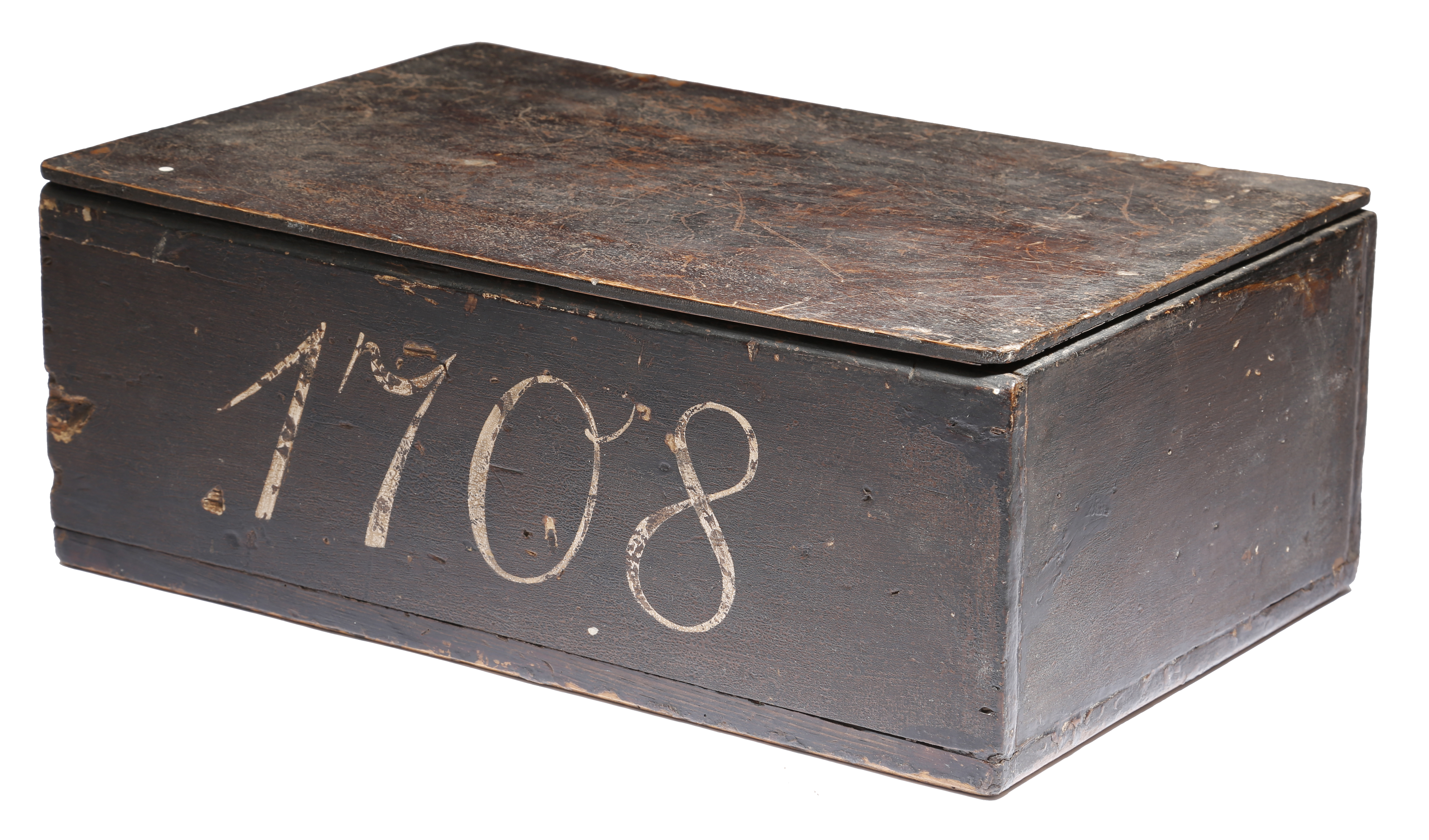 An 18th century stained pine deeds box, the hinged lid revealing a vacant interior, the front painted with the date '1708', 16.5cm high, 44.5cm wide, 29.4cm deep.