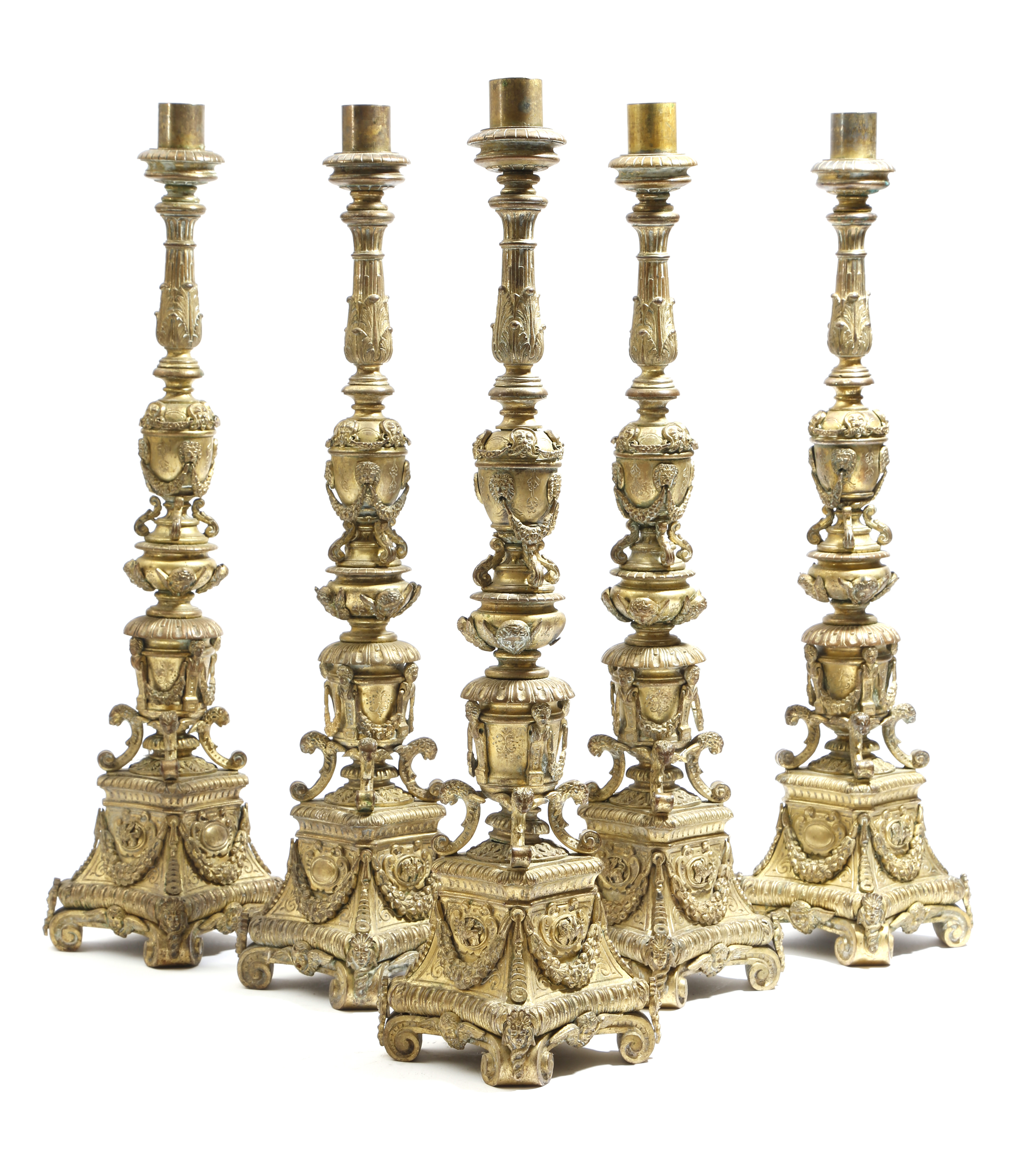 A set of five 18th century Italian Venetian gilt bronze altar style candlesticks