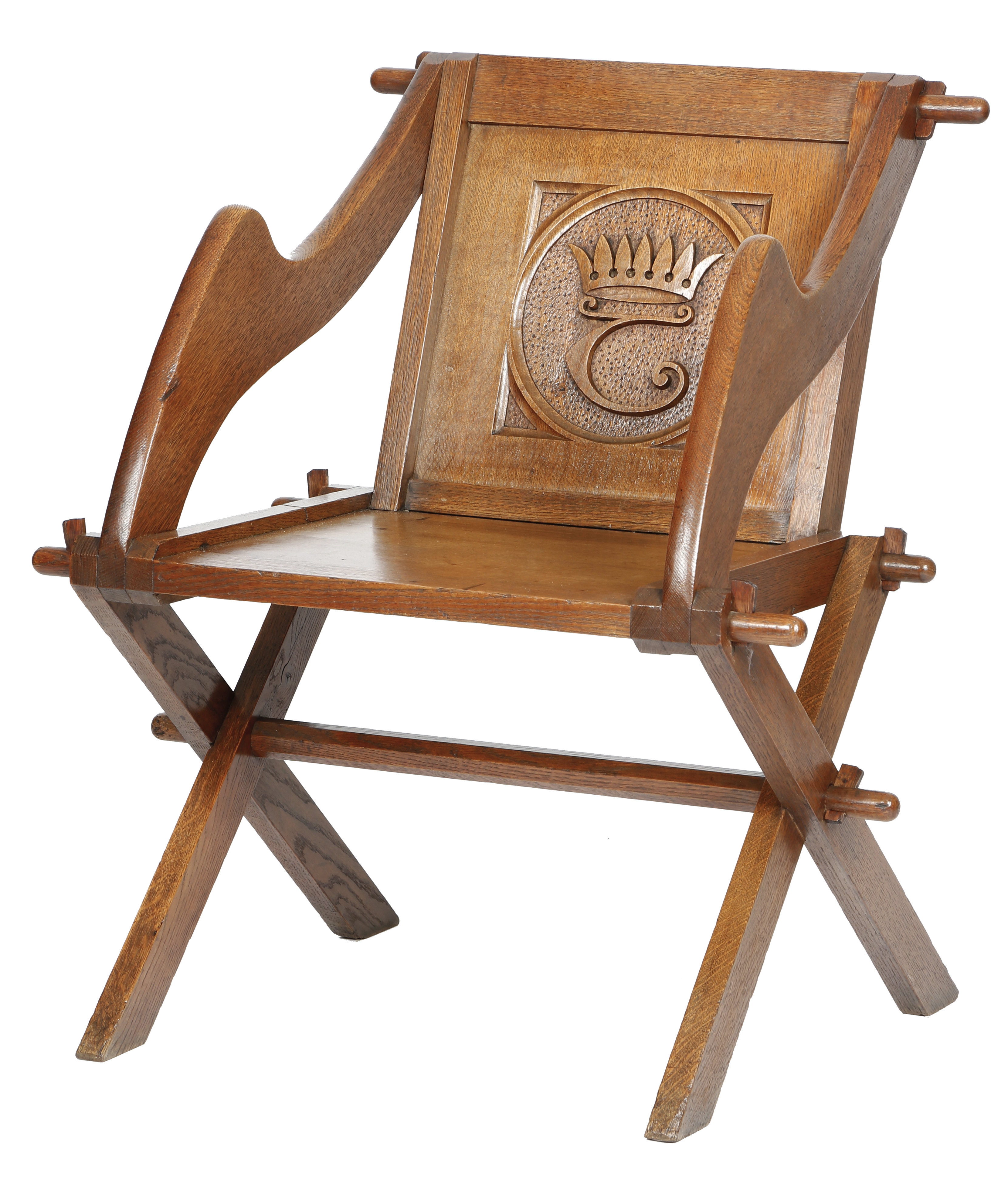 A Victorian oak Glastonbury chair, the panelled back carved with a Ducal coronet, on 'X' shape supports united by a stretcher.