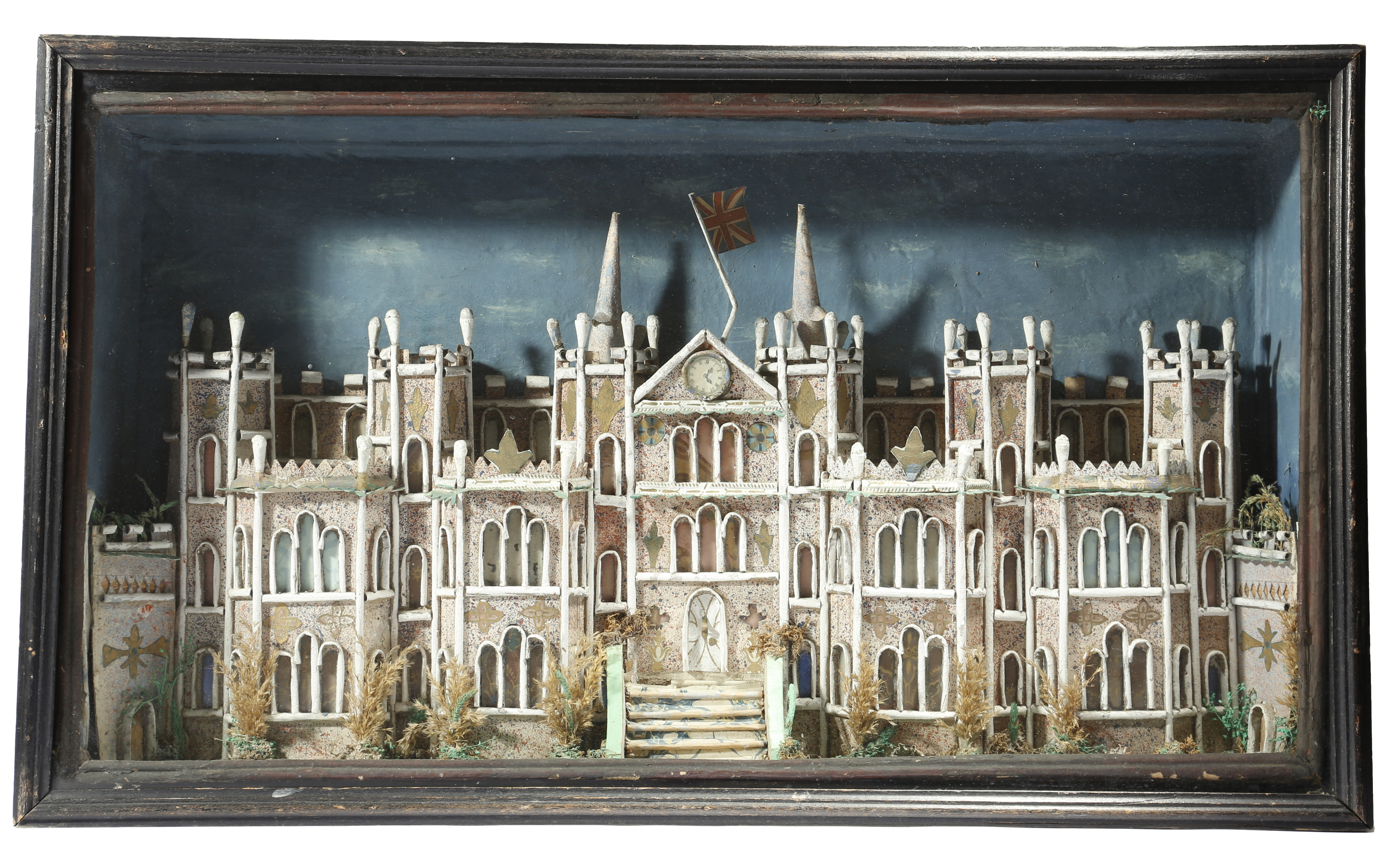 A Victorian rolled paper diorama of a Gothic country house, with marbled paper steps, with applied grasses and a painted background, in a glazed ebonised case, 47.2cm high, 80.3cm wide, 16.6cm deep.