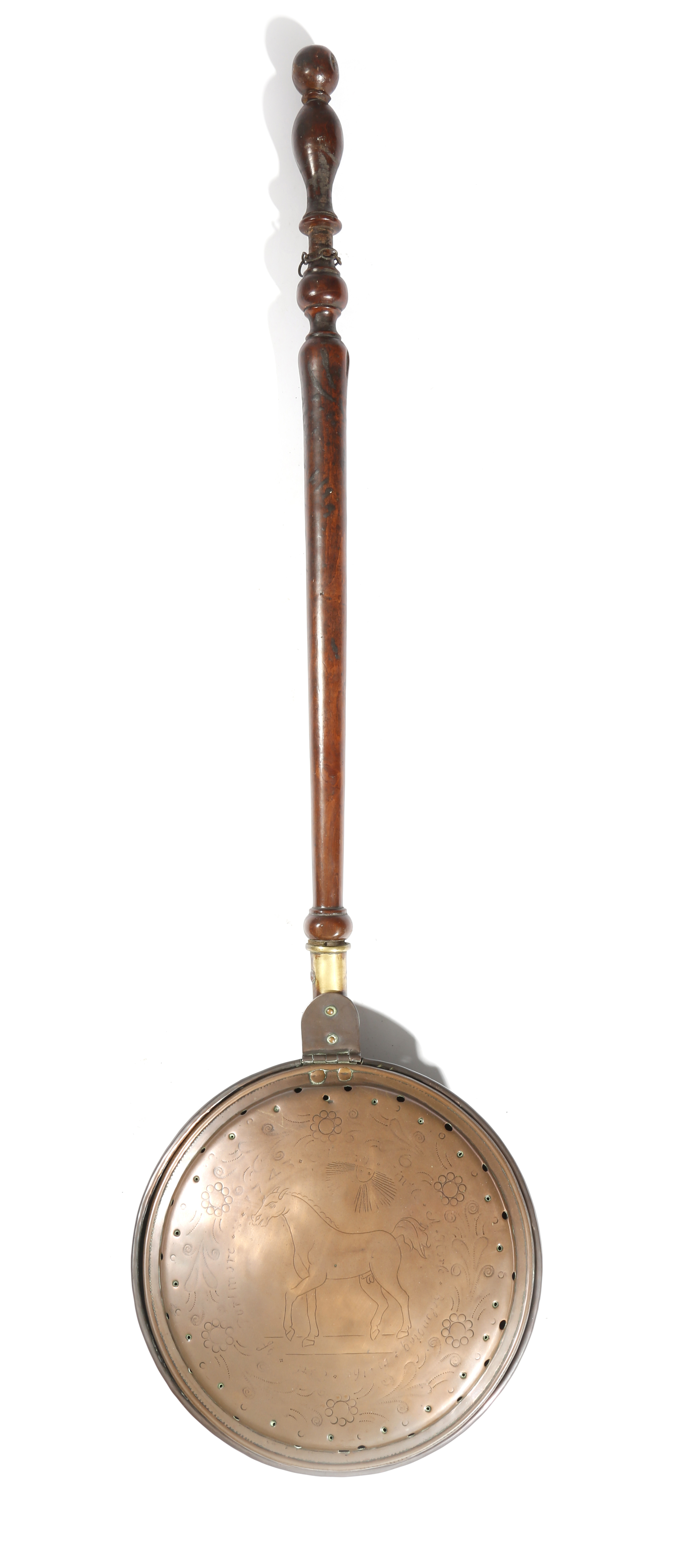 Horse racing interest. A George II folk art copper warming pan, with a turned fruitwood handle, the hinged lid pierced and naively engraved with flowers and leaves and centred with a stallion, inscribed '... A HORSE BELONGING TO THE EARL OF PORTMORE 1743', 114cm long.