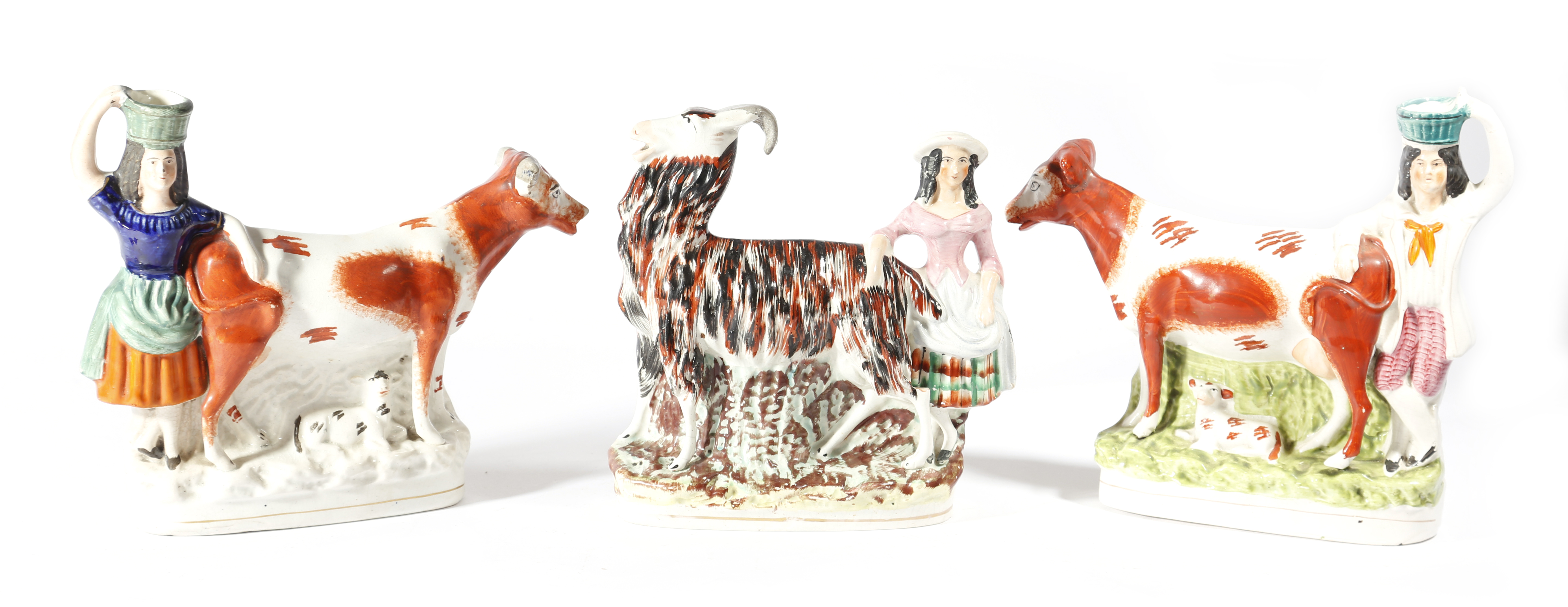 A Victorian Staffordshire pottery flat back goat jug / creamer, modelled with a Scottish milkmaid, together with a pair of Staffordshire cow jugs / creamers, 22.5cm high (max). (3)