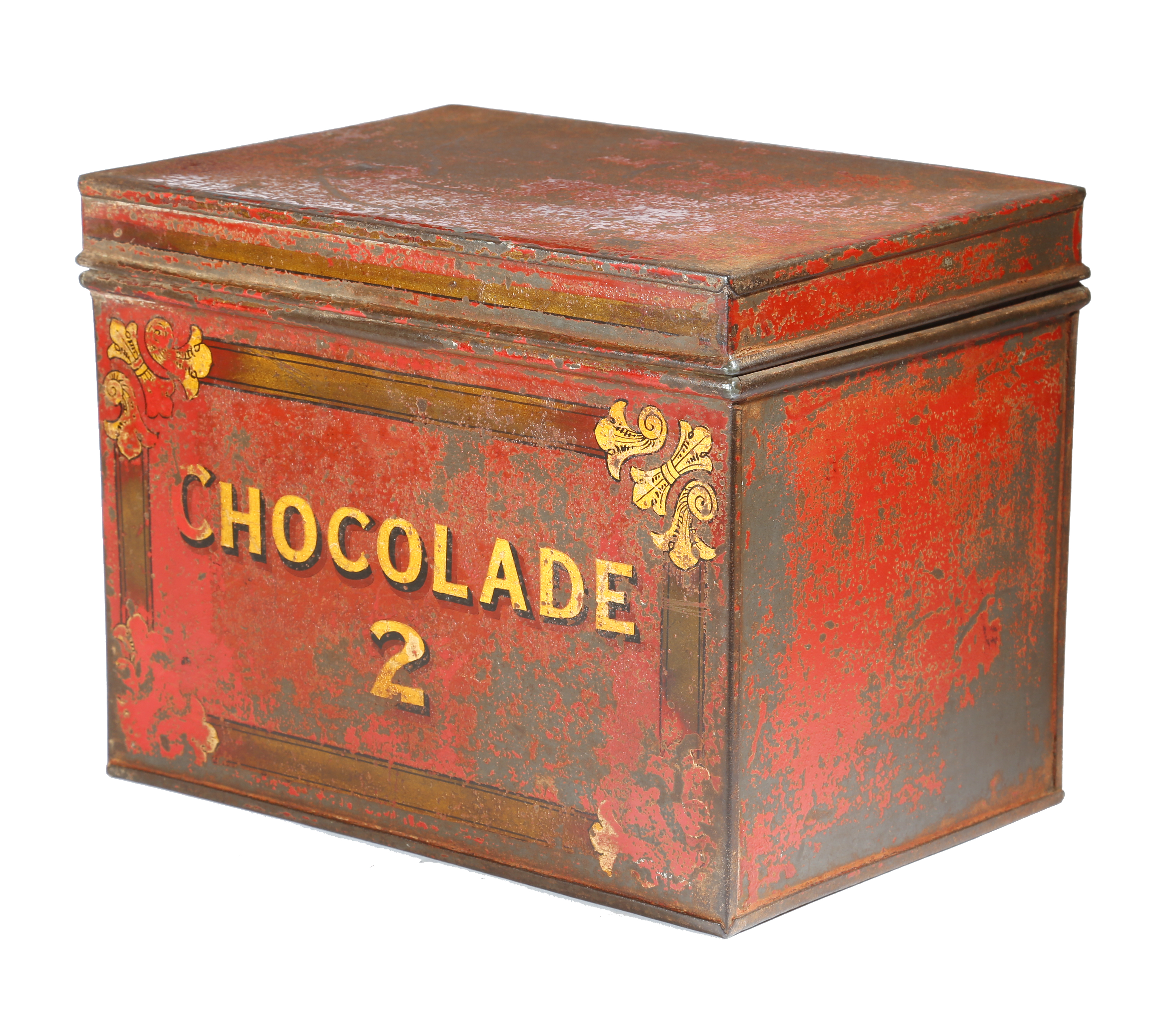 A Victorian red japanned tôle shop display canister, with a hinged lid, the front with a gilt border decoration, inscribed 'CHOCOLADE 2', the back with an oval stamp, inscribed 'JOHN A. GILBERT & CO. MAKERS LONDON', 25.4cm high, 33.2cm wide, 22.5cm deep.