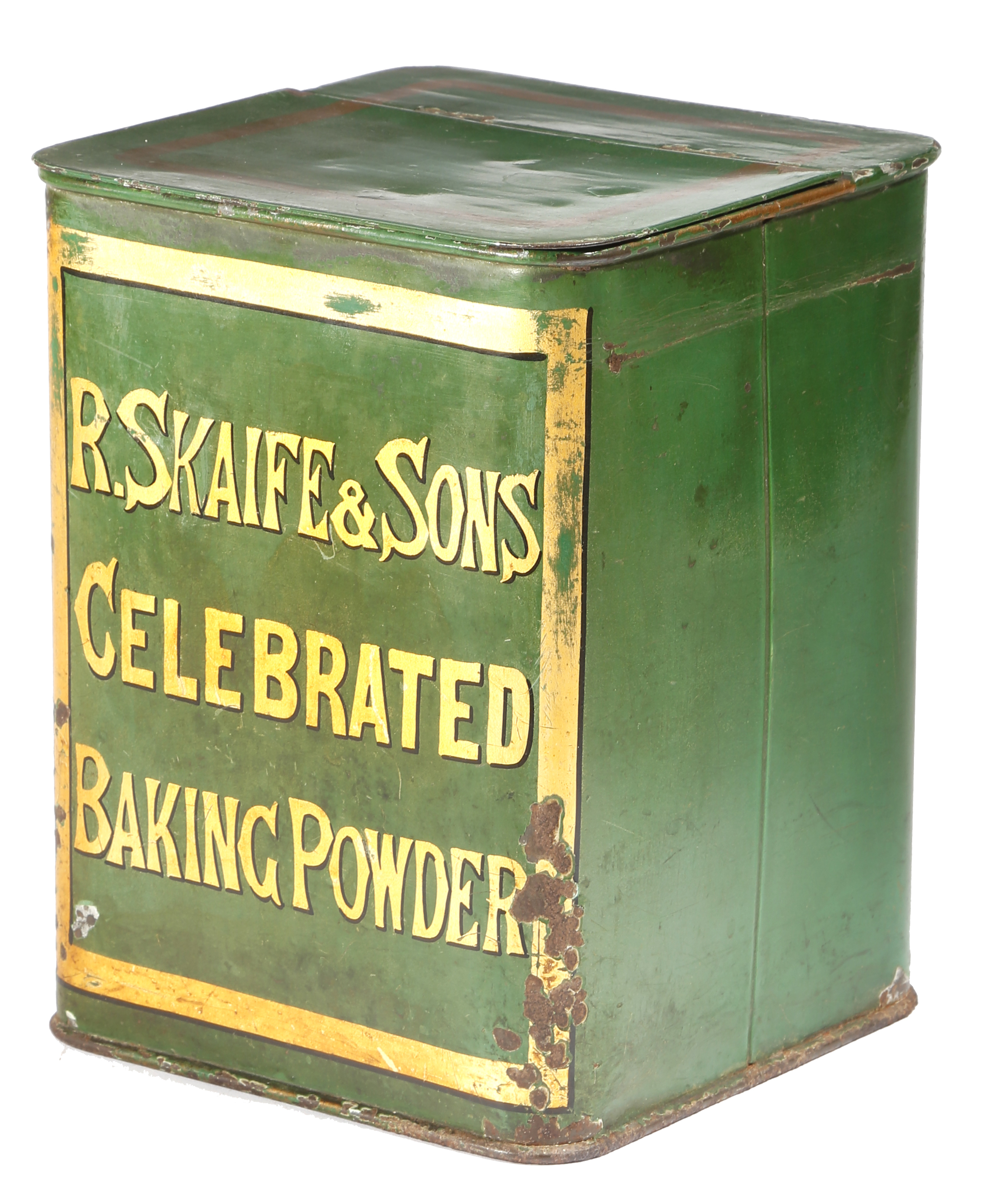 A Victorian green japanned tôle shop display canister, inscribed 'R. Skaife & Sons Celebrated Baking Powder', with a hinged lid, 25.4cm high, 19.5cm square.