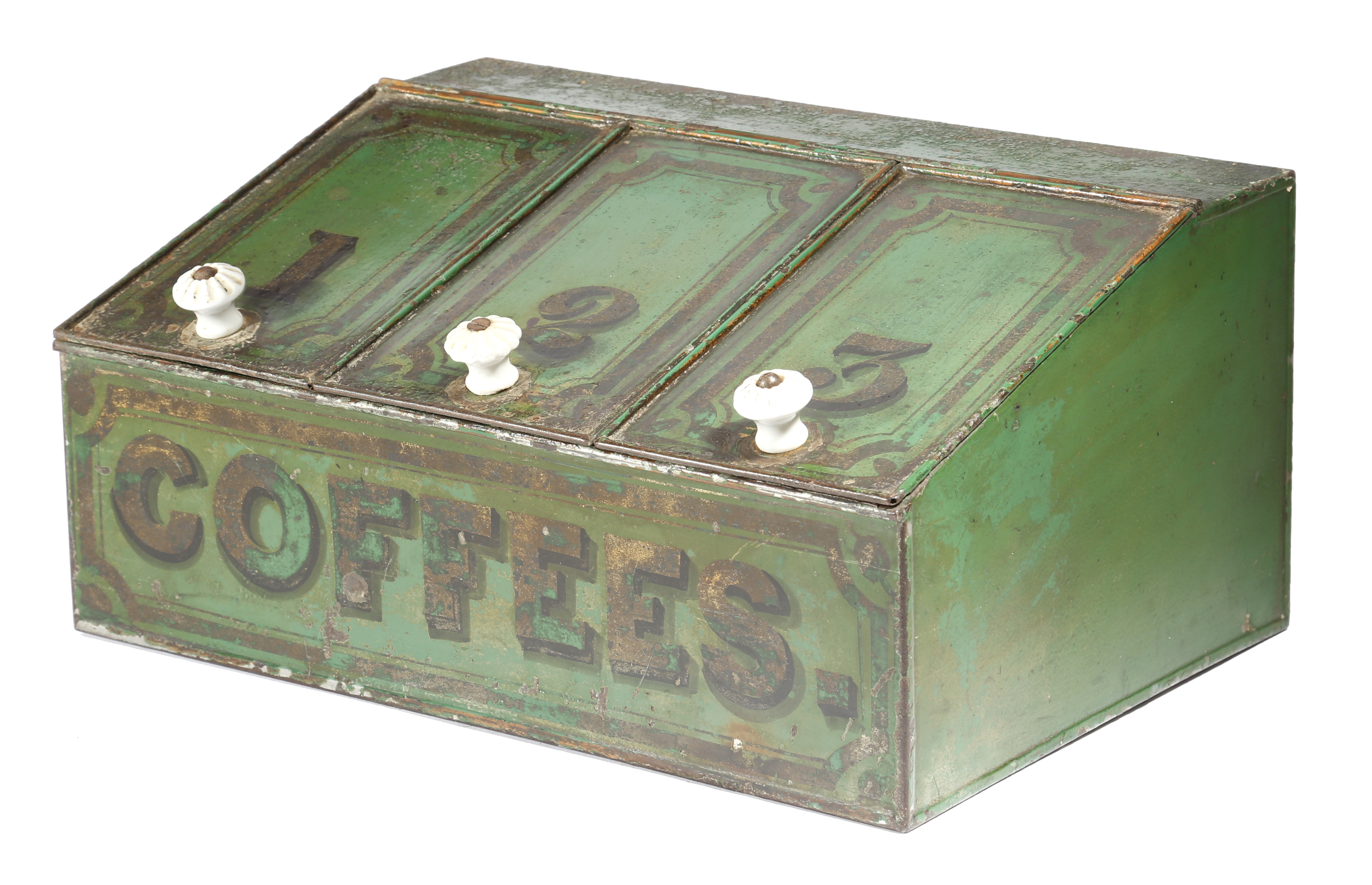 A Victorian green japanned tôle shop display coffee canister, with three compartments, each with a hinged lid, with a white painted flower shaped handle and numbered consecutively, the front inscribed 'COFFEES.', with remains of gilt paint, 17.6cm high, 37.3cm wide, 25.9cm deep.