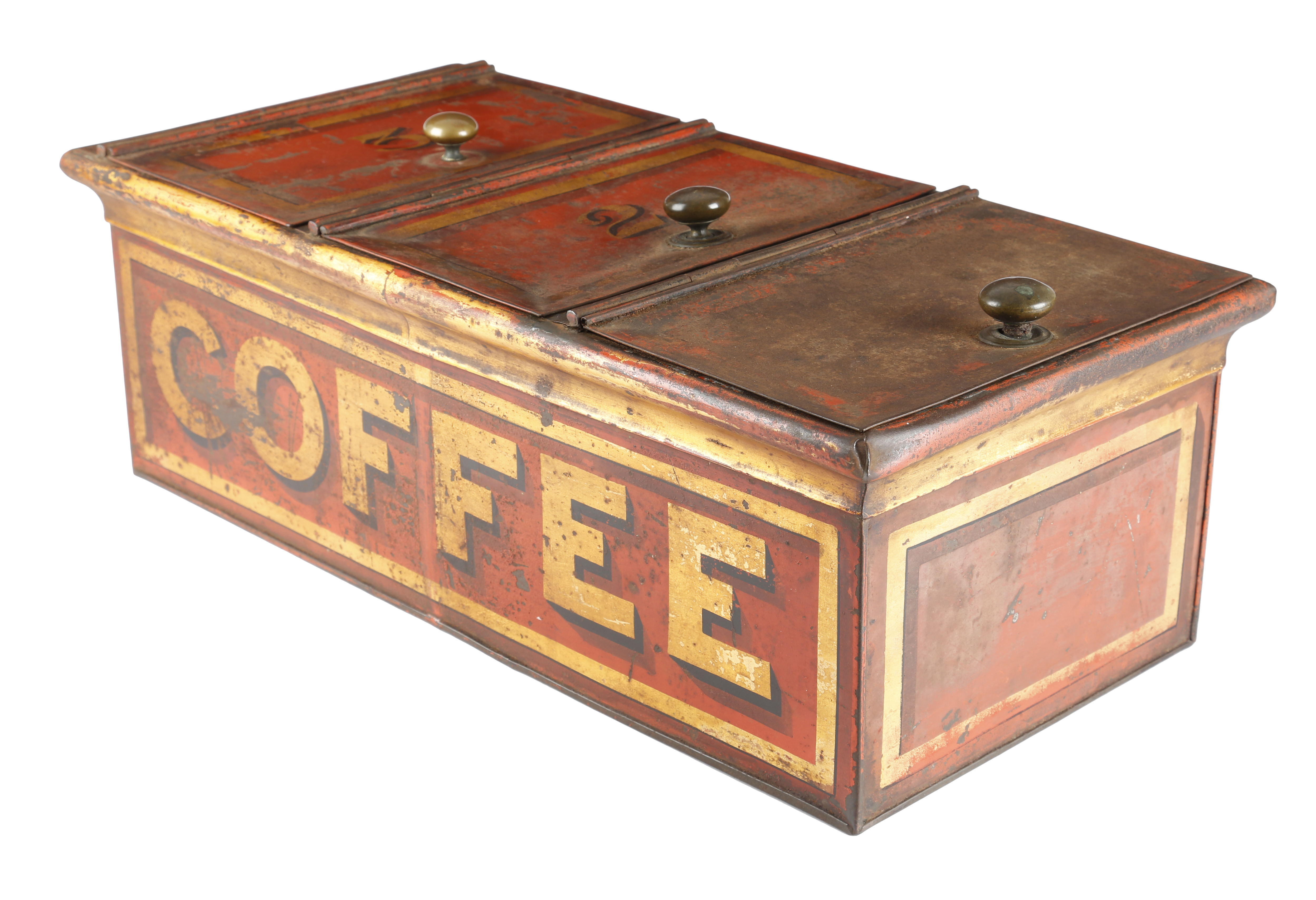 A Victorian red japanned tôle shop display coffee canister, with three compartments, each with a hinged lid with a knob handle and numbered consecutively, decorated in gilt, three sides inscribed 'COFFEE', 23cm high, 64.5cm wide, 31.5cm deep.