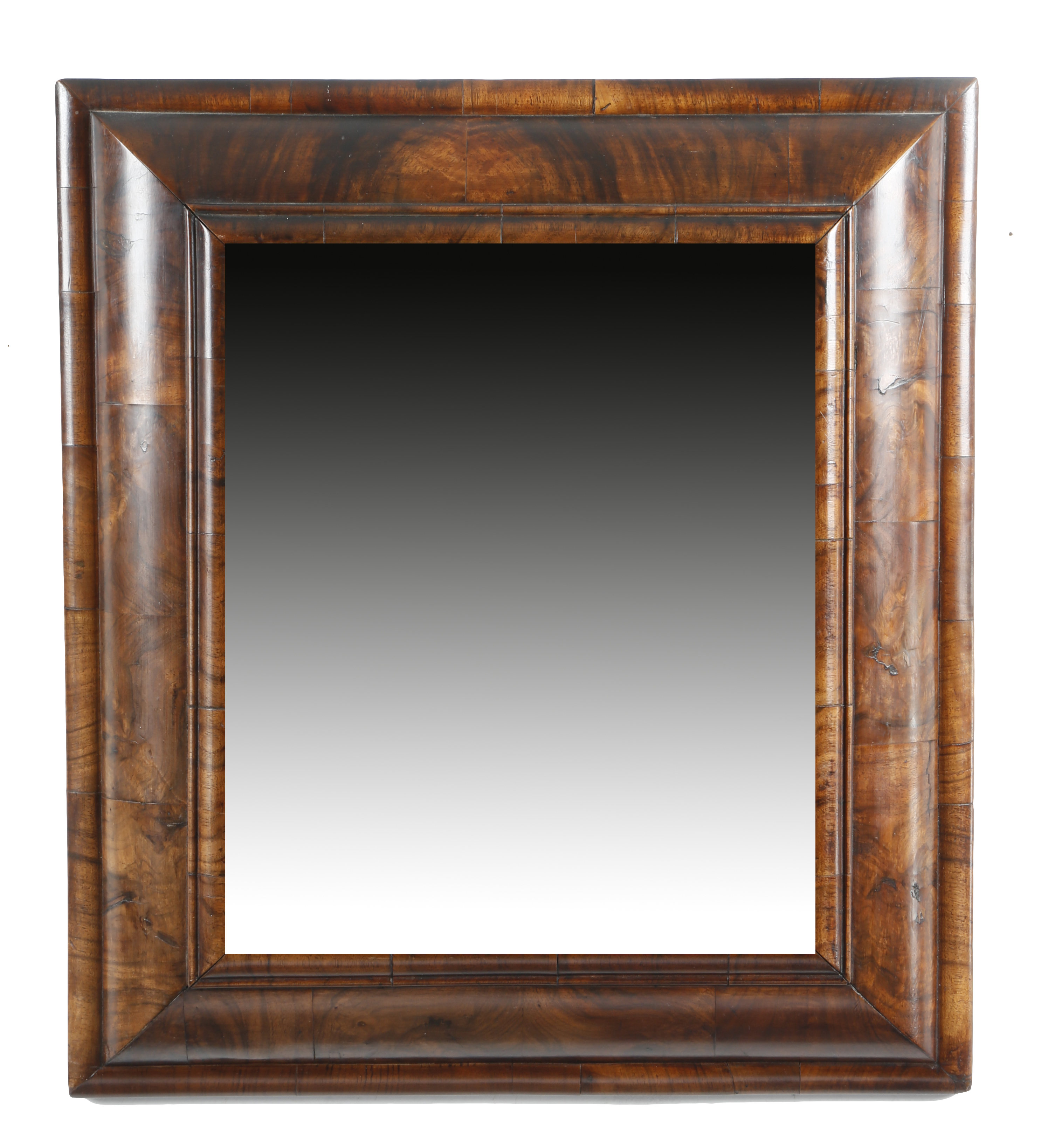 A William and Mary walnut cushion frame wall mirror, the later rectangular bevelled plate within a moulded frame, originally with a cresting, 60 x 53cm.