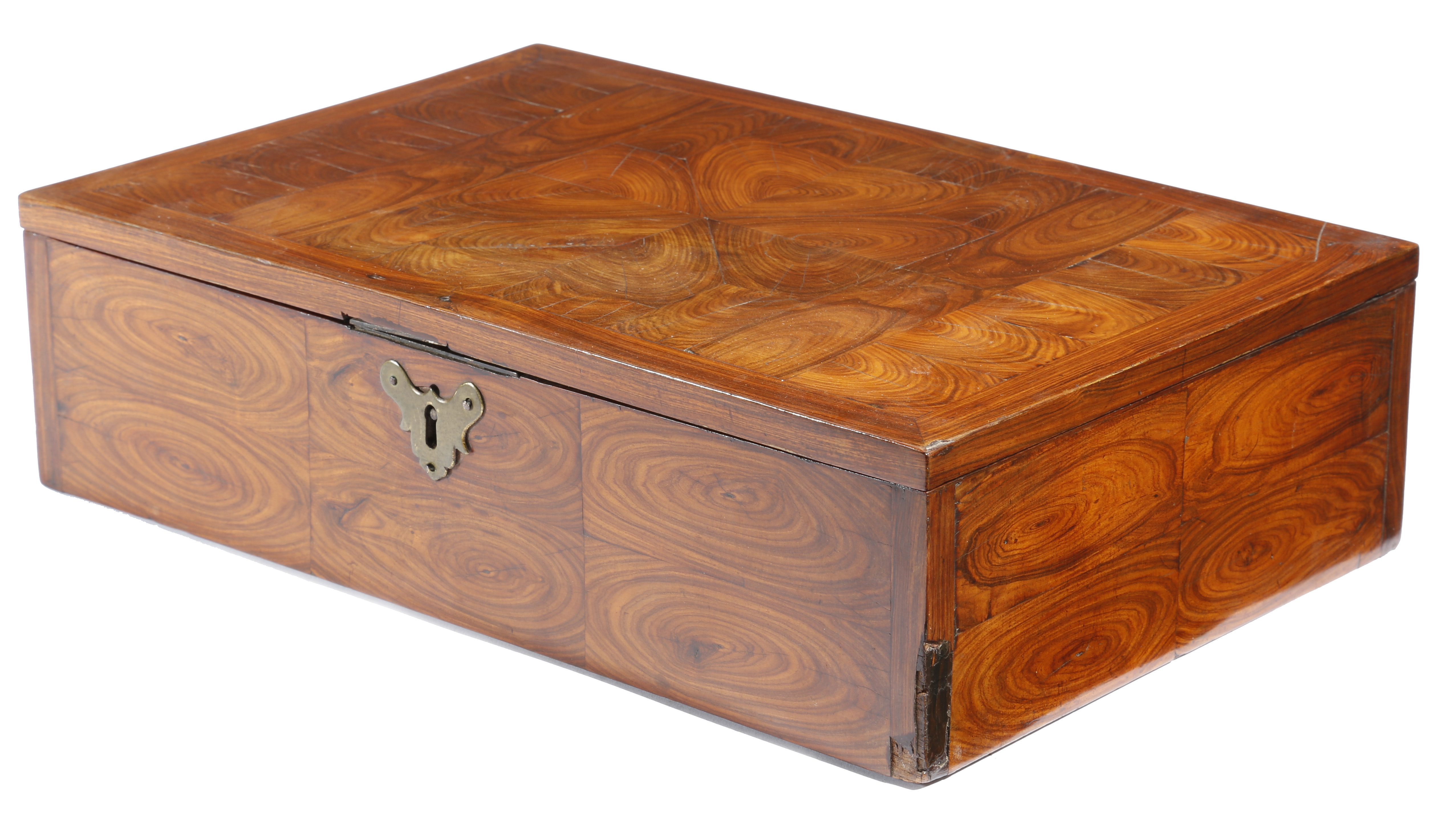An 18th century oyster veneered kingwood lace box, the hinged lid revealing a later velvet lined vacant interior, with a brass escutcheon, 11.5cm high, 41.2cm wide, 27.3cm deep.