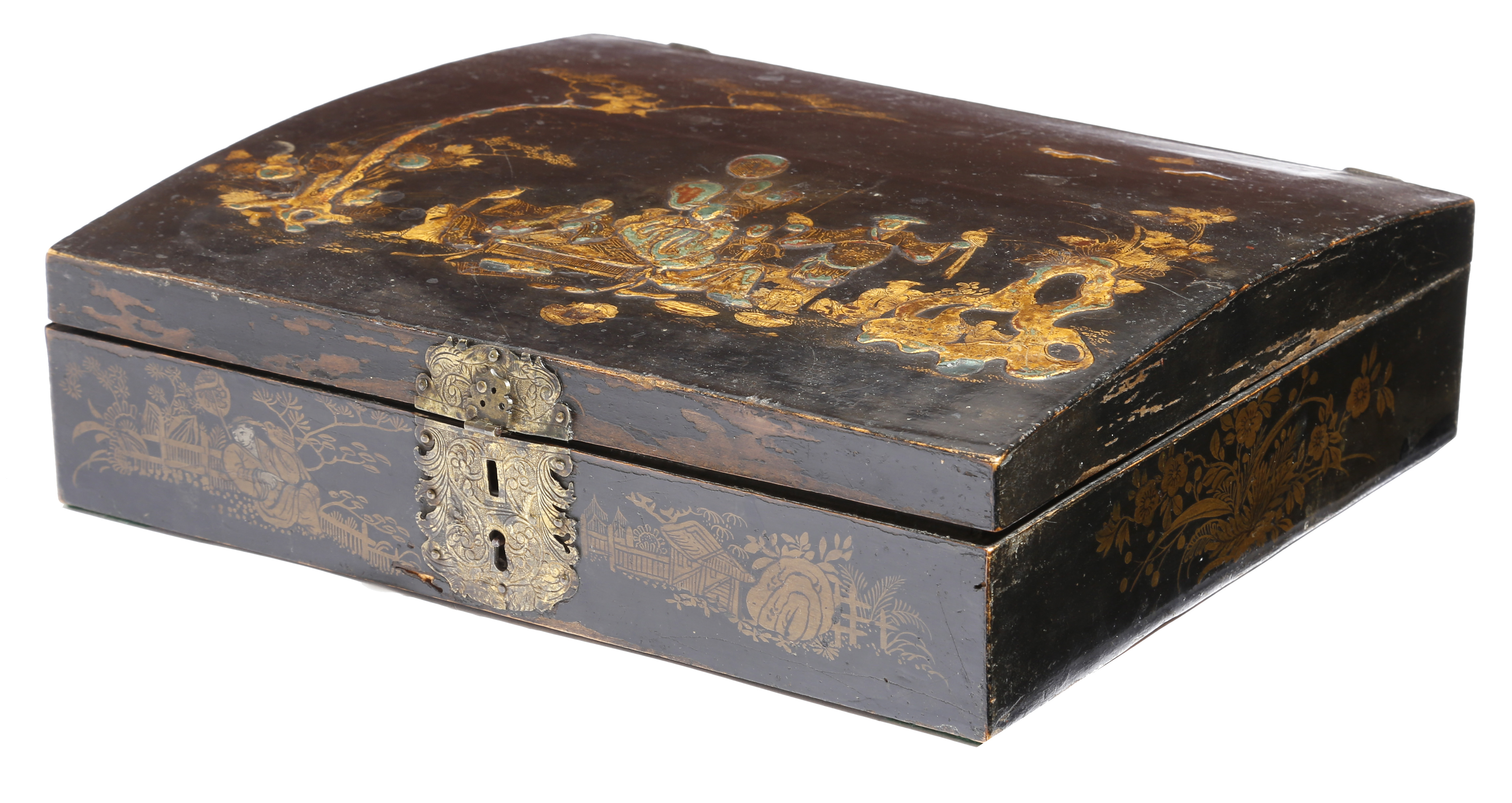 An early 18th century black japanned lace box, the domed hinged lid decorated with gilt raised chinoiserie with figures, trees and birds, with a gilt speckled interior, the brass lock with engraved decoration, 8.7cm high, 30.2cm wide, 25.5cm deep.