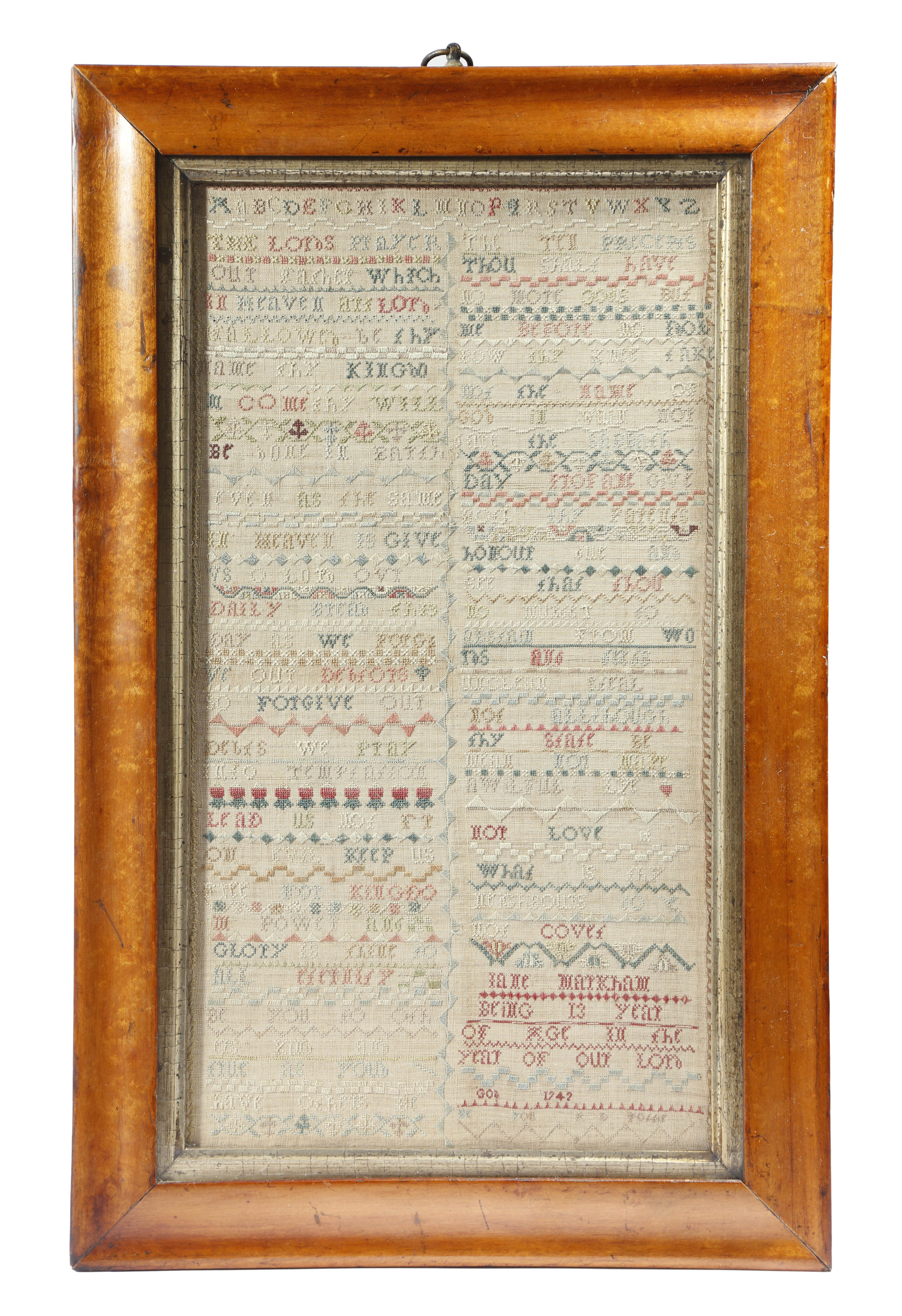 A George II needlework sampler by Jane Markham, worked in coloured silks, on a linen ground with an alphabet and the Lord's prayer and with bands of flowers and geometric designs, inscribed 'JANE MARKHAM BEING 13 YEAR OF AGE IN THE YEAR OF OUR LORD 1742', 38.5 x 20.8cm, in a later glazed bird's eye maple frame.