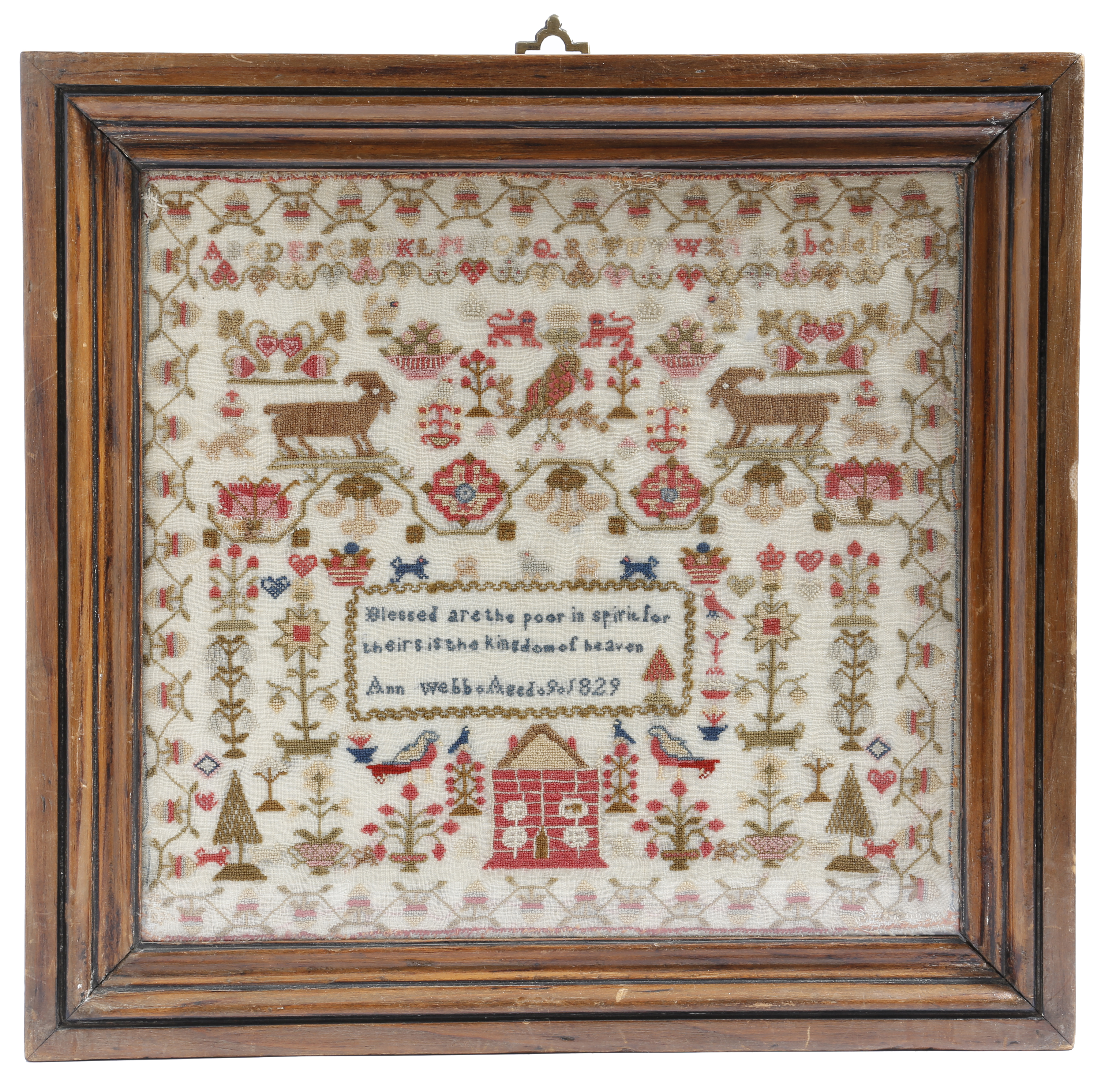 A George IV needlework sampler by Ann Webb, worked with coloured thread with an alphabet, pairs of lions, rams and birds, with a house, urns of flowers and bands of scrolling flowers, inscribed 'Blessed are the poor in spirit for theirs is the kingdom of heaven' and signed 'Ann Webb Aged 9 1829', 30.2 x 32cm, in a glazed moulded wood frame.