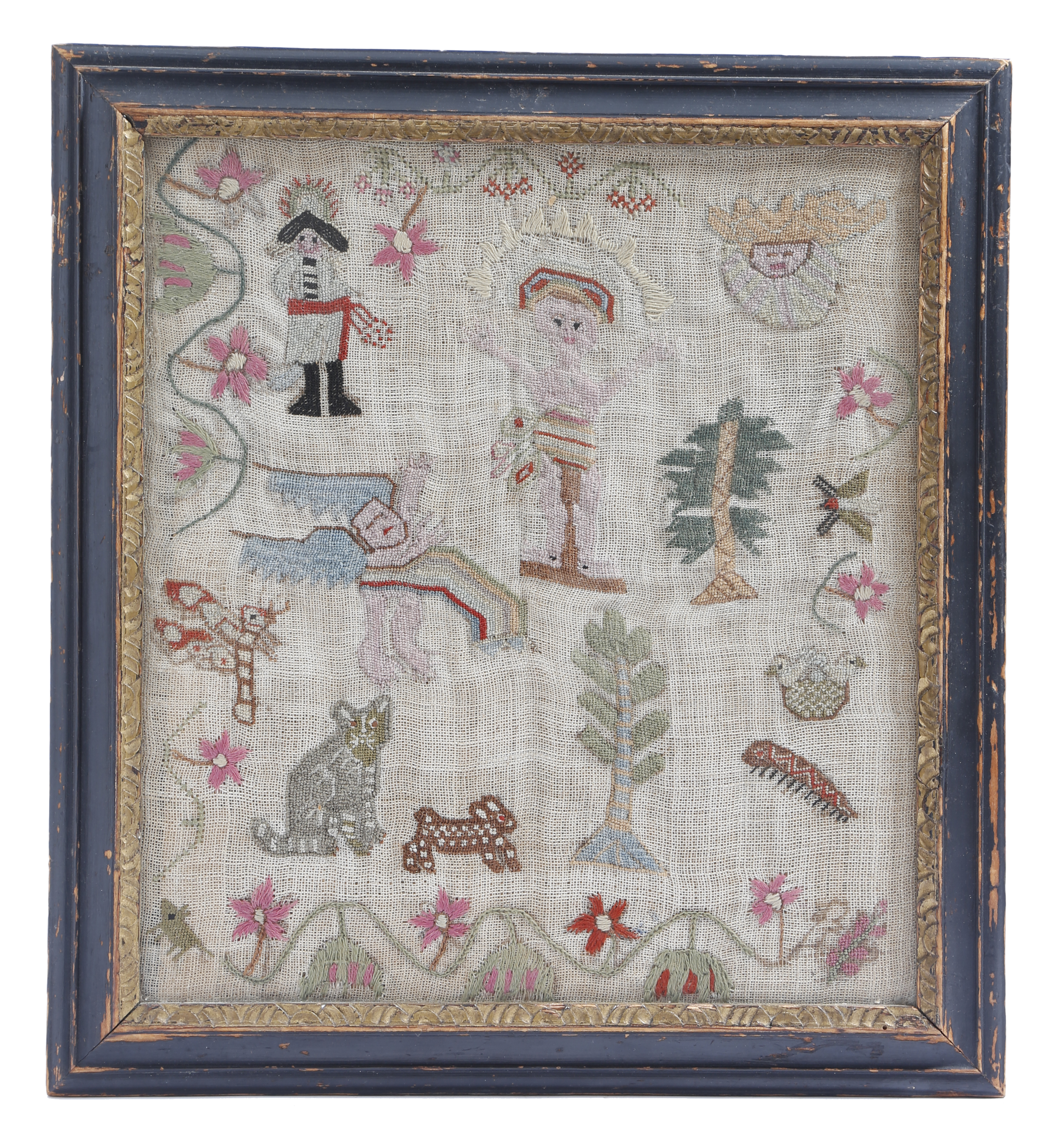 An 18th century naive needlework sampler, worked in coloured threads on a linen ground with Corpus Christi, an angel, a Naval officer, a caterpillar, a cat, a rabbit, a band of scrolling flowers and other motifs, 27.2 x 24.5cm, in an ebonised and gilt glazed frame.