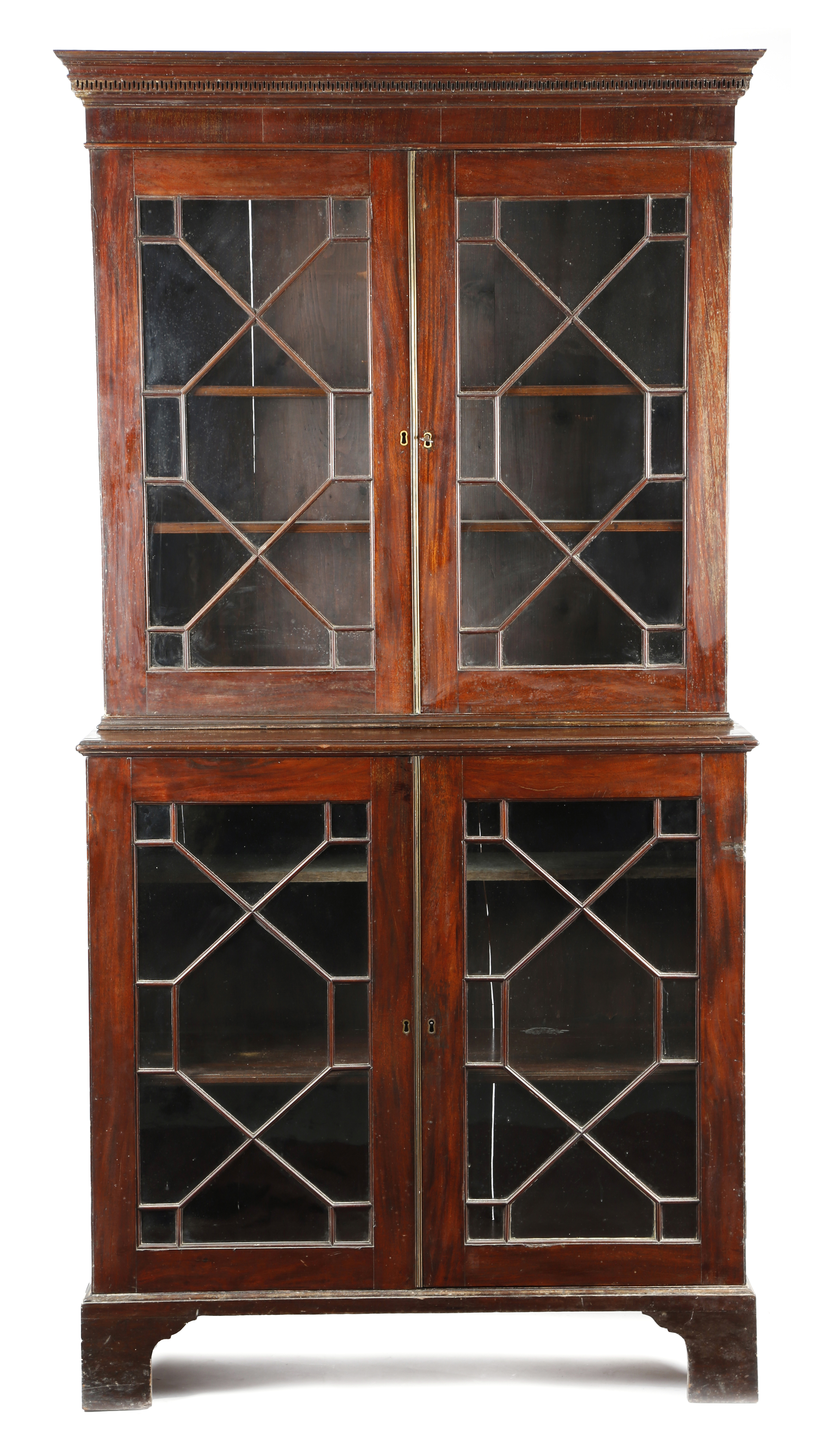 A George III mahogany bookcase, the Greek key cornice above a pair of astragal glazed doors, enclosing two adjustable shelves, above a conforming base, on bracket feet, 215.2cm high, 112cm wide, 45cm deep.