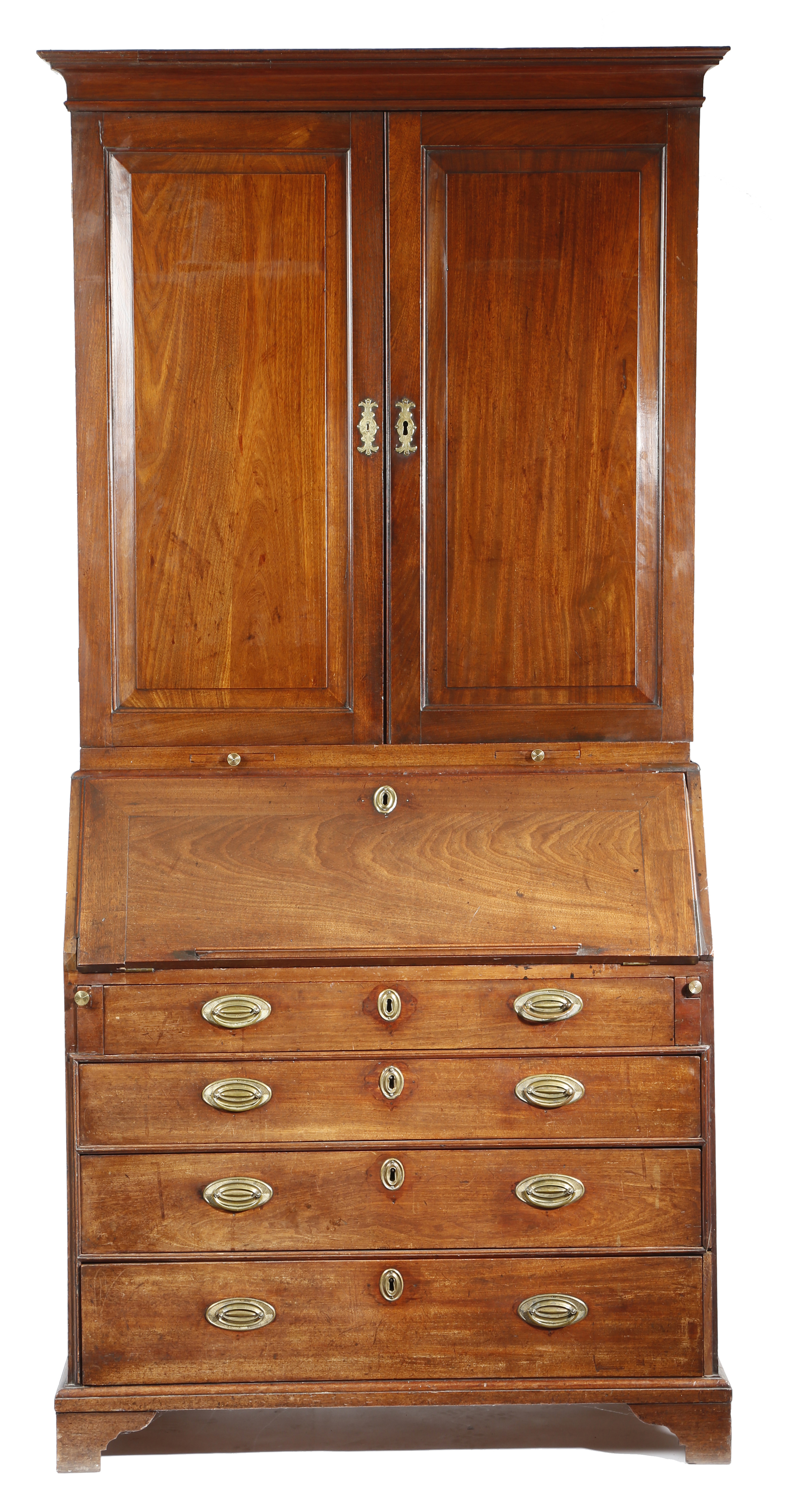 A George II mahogany bureau cabinet, the moulded cornice above a pair of fielded panel doors, enclosing three adjustable shelves, above a pair of candle slides, above a hinged fall, the interior with an arrangement of pigeonholes and drawers, above four long graduated drawers, on bracket feet, 206.8cm high, 101.1cm wide, 55cm deep.