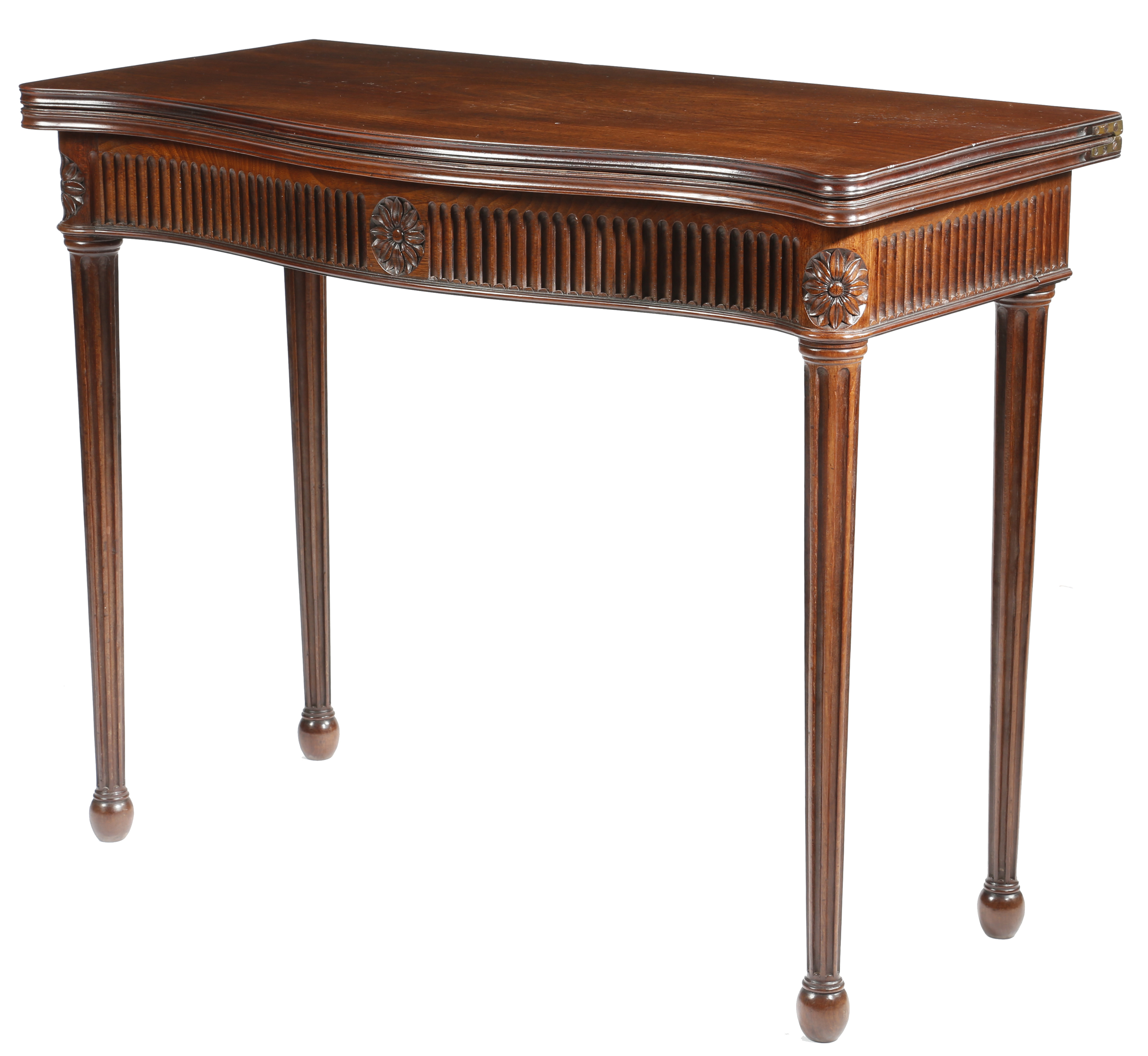 A George III mahogany serpentine front card table, the fold-over top with a moulded edge on twin gate supports, above a fluted frieze and carved flower head rondels, on fluted tapering legs and turned feet, 71.6cm high, 90.8cm wide, 43.8cm deep.