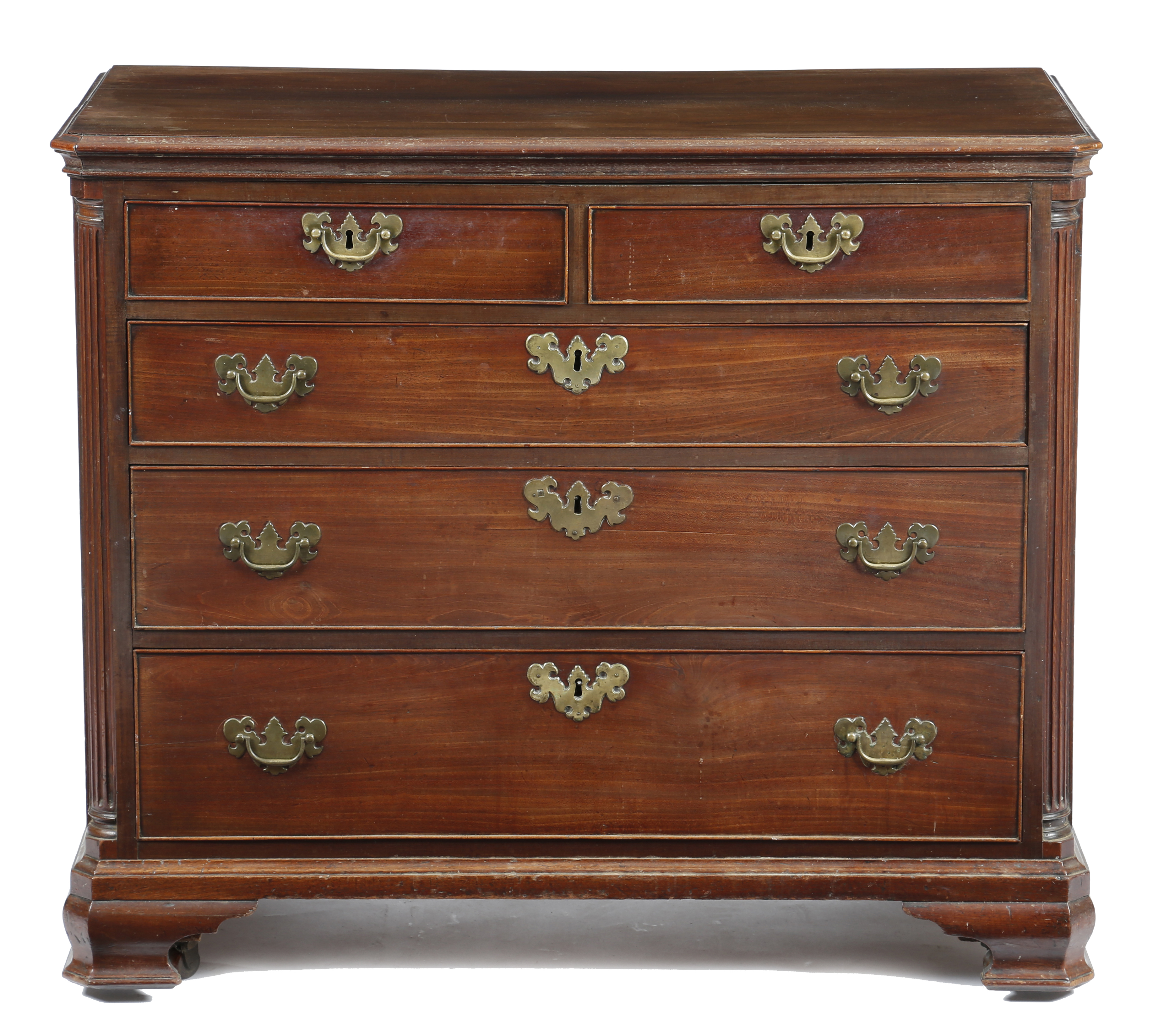 A George III Lancashire mahogany chest, the rectangular top with a moulded edge, above two short and three long graduated drawers, flanked by fluted quarter pilasters, on ogee bracket feet and castors, 81cm high, 94.6cm wide, 48.5cm deep.