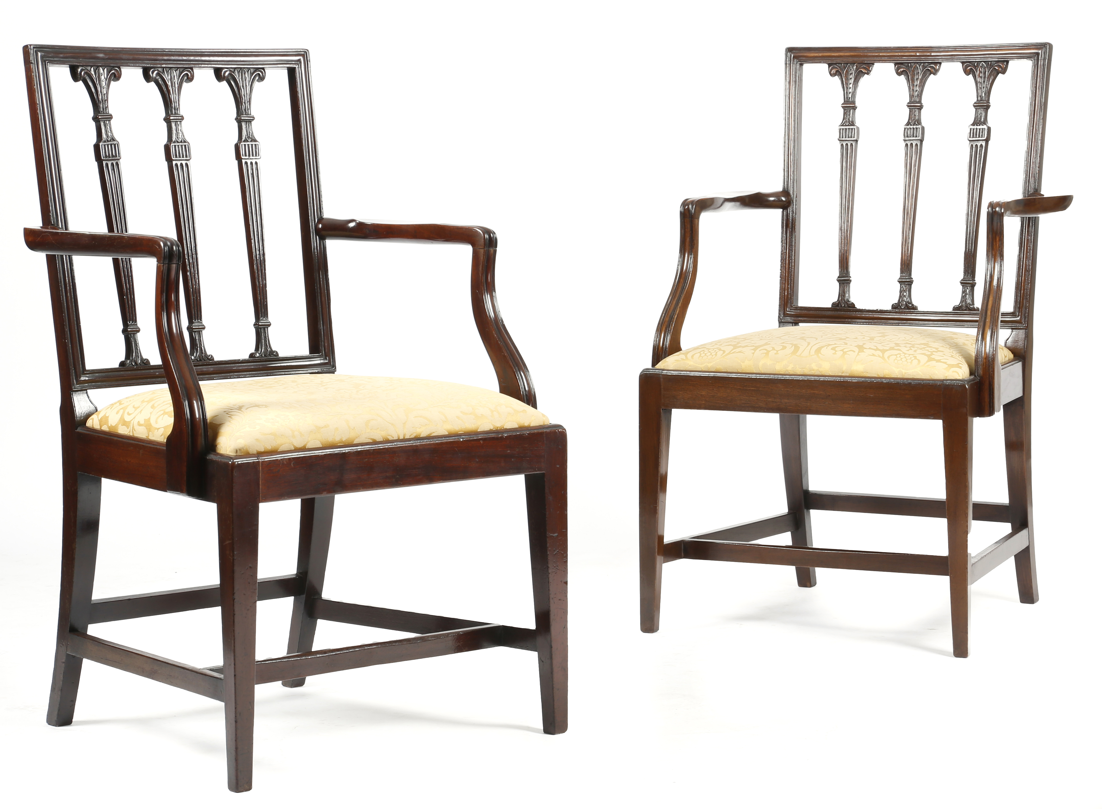 A George III mahogany open armchair attributed to Gillows, the moulded square back with three fluted vertical splats with leaf carved capitals, above a drop-in seat, on square tapering legs united by stretchers with a 'V' mortice, together with a later mahogany copy. (2)