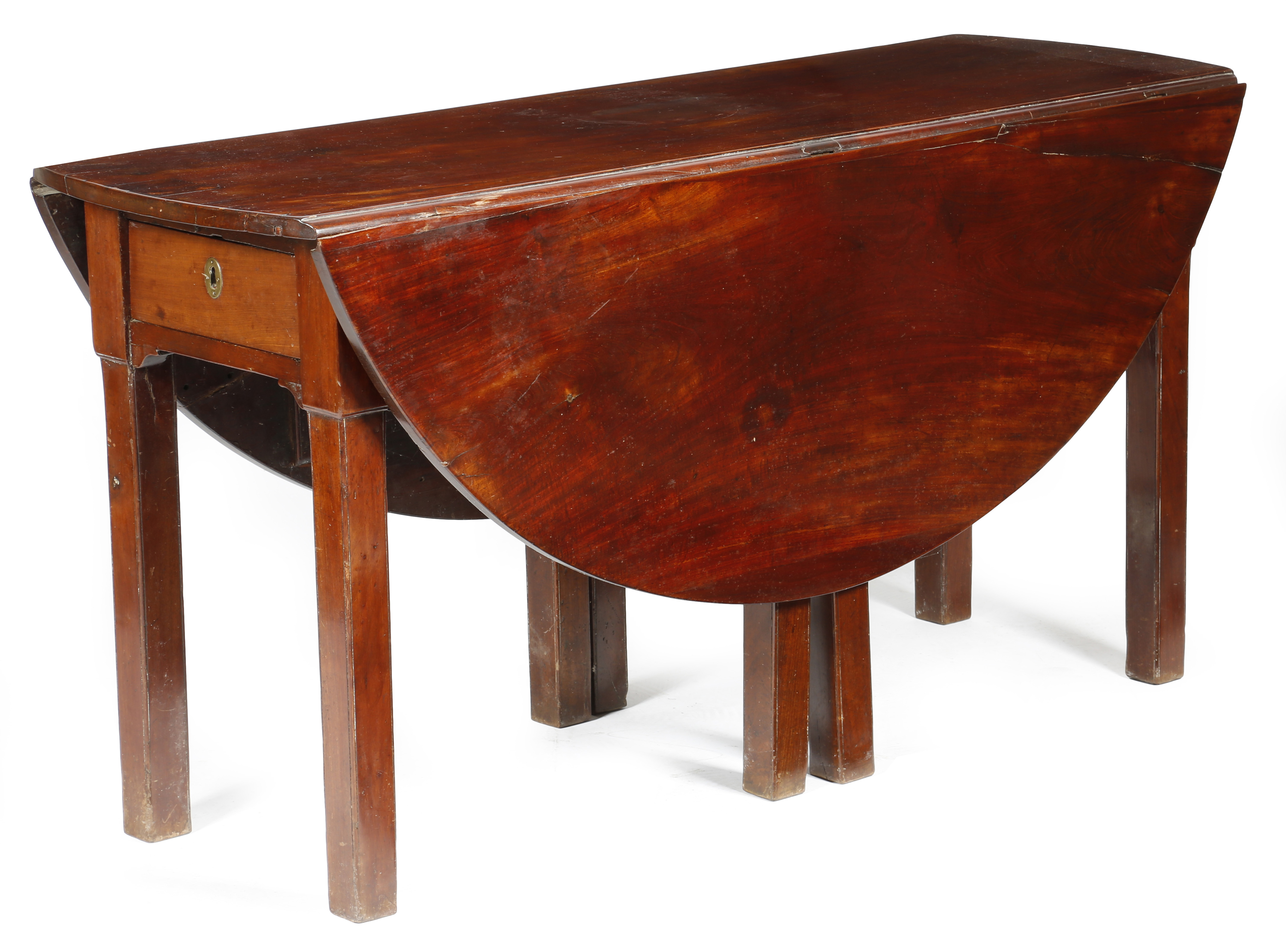 A George III mahogany wake style dining table, the oval drop-leaf top above a frieze drawer to either end, on channelled square legs, possibly Irish, 74.9cm high, 145.2 x 144.4cm (open).