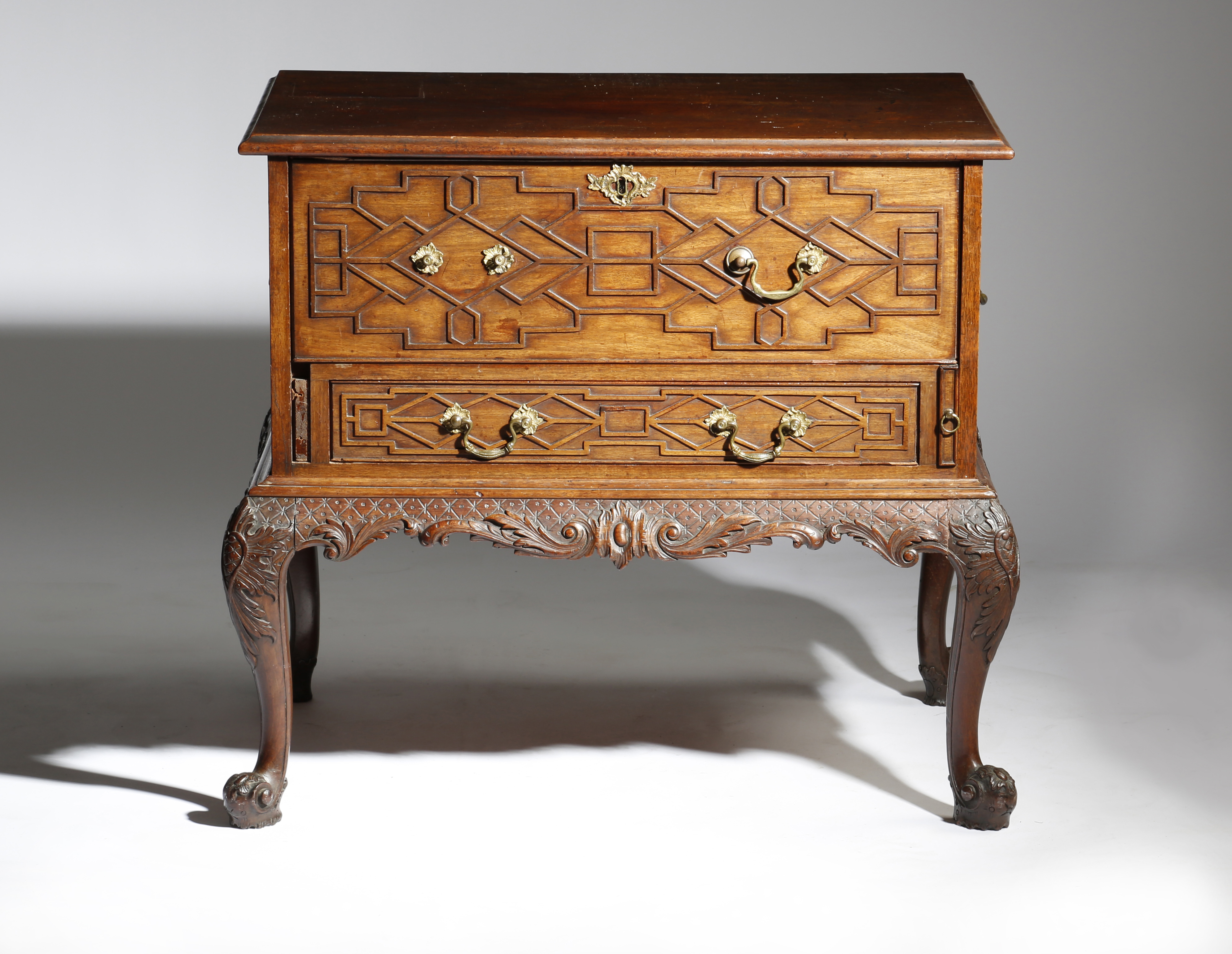 An early George III mahogany silver chest on stand, the rectangular top with a moulded edge, above two drawers with blind fret decoration, the top deep drawer lined with baize and originally with a tray, the lower drawer flanked by lopers, with brass side carrying handles, the stand carved with leaves on a diaper ground, on leaf and cartouche carved cabriole legs and rocaille scroll feet, originally on castors, 71.7cm high, 80.5cm wide, 58cm deep.