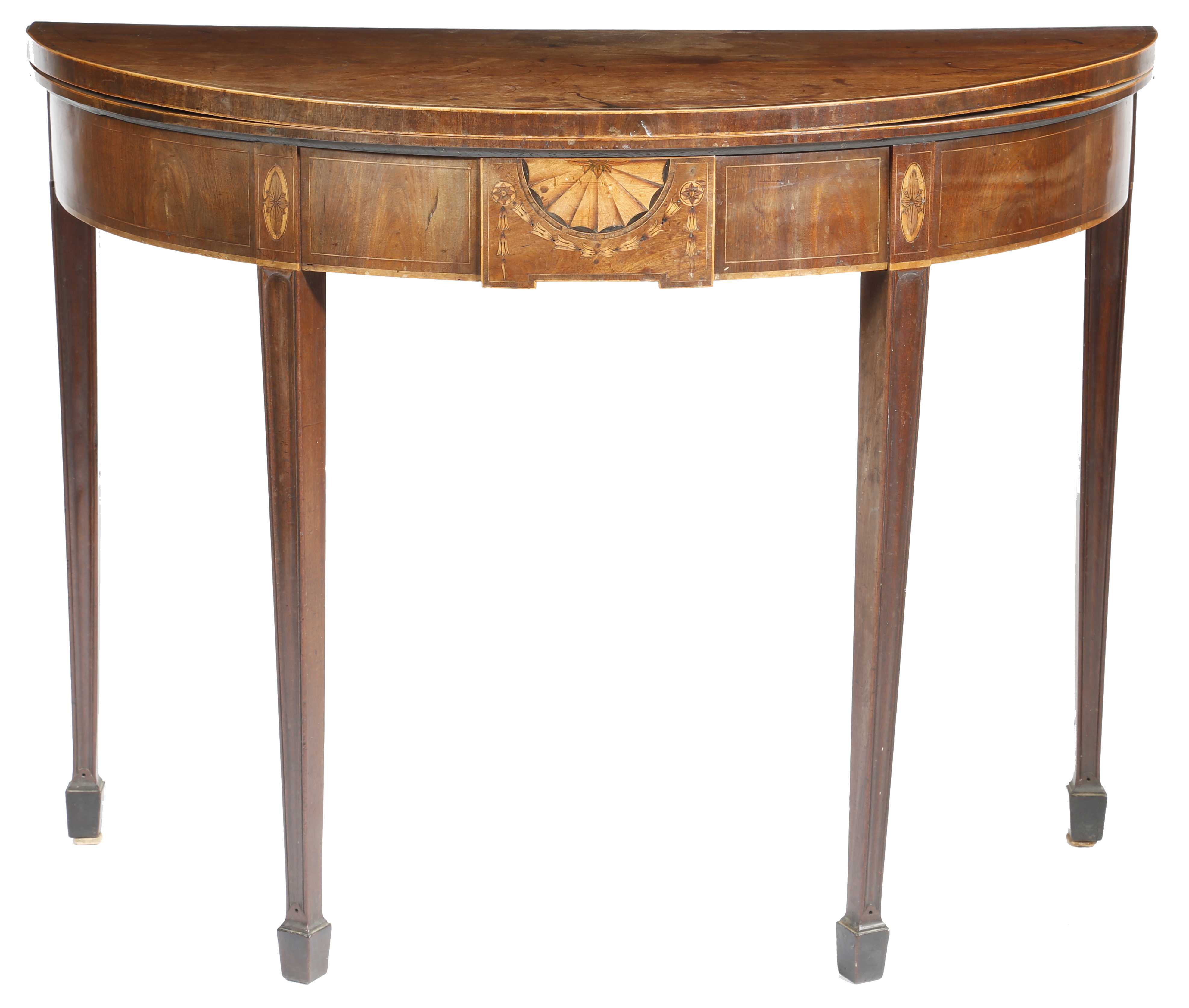 A George III mahogany demi-lune tea table in the manner of Gillows, inlaid with stringing, the crossbanded fold-over top on twin gate supports, the frieze with a central tablet marquetry inlaid with a fan patera, bell flower, husks and flower head paterae, on moulded square tapering legs and spade feet, 75.3cm high, 99.5cm wide, 49cm deep.