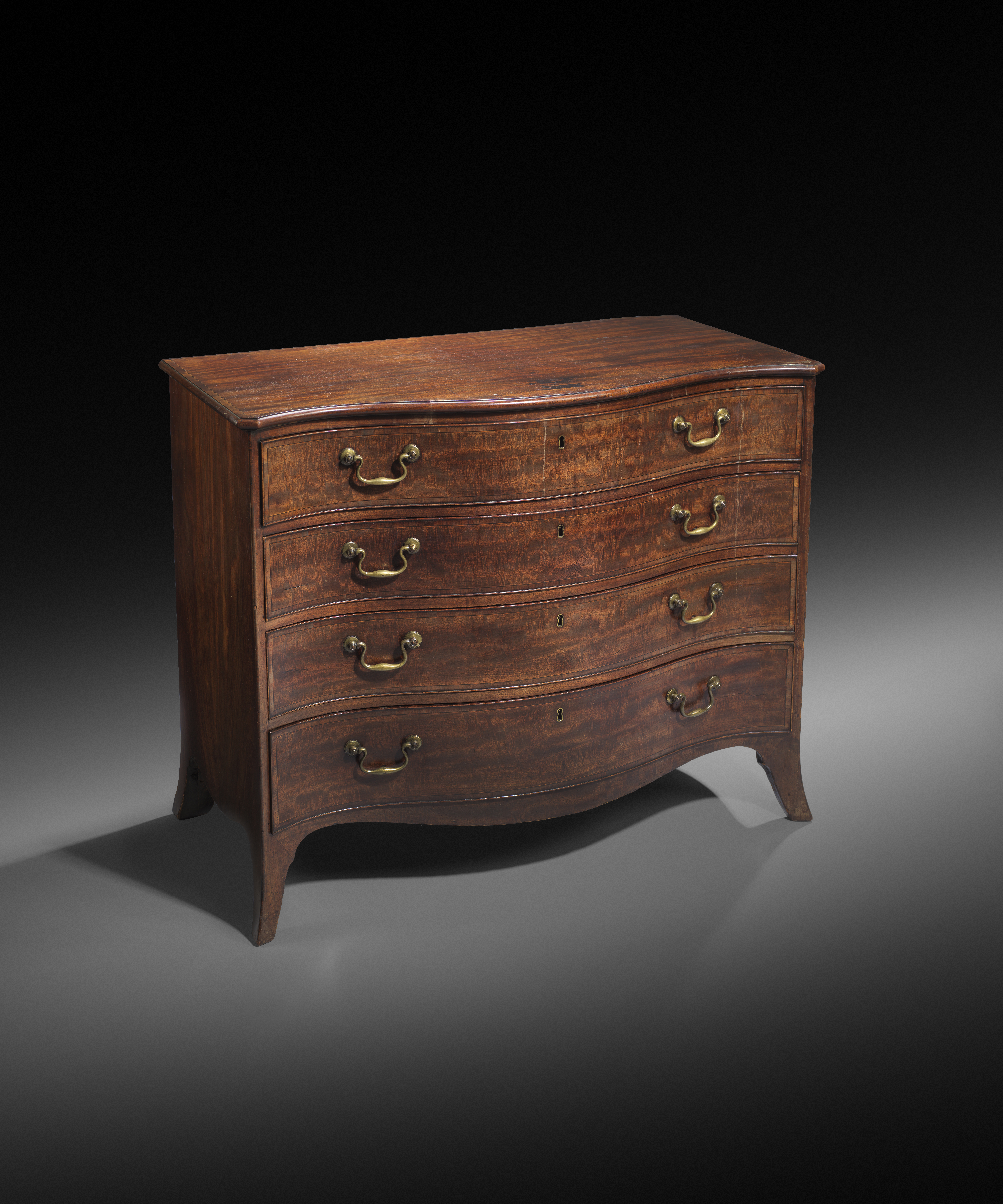 A George III fiddleback mahogany serpentine dressing chest, inlaid with ebonised and boxwood stringing and crossbanded with goncalo alves, the fitted top drawer with a baize lined slide revealing lidded and open compartments, divisions for combs, razors and glass bottles, with a pink cushion and an adjustable shaving mirror on a ratchet, the side with a hinged pen and ink compartment, above three further long drawers, on French bracket feet, 85.5cm high, 107cm wide, 55.8cm deep.