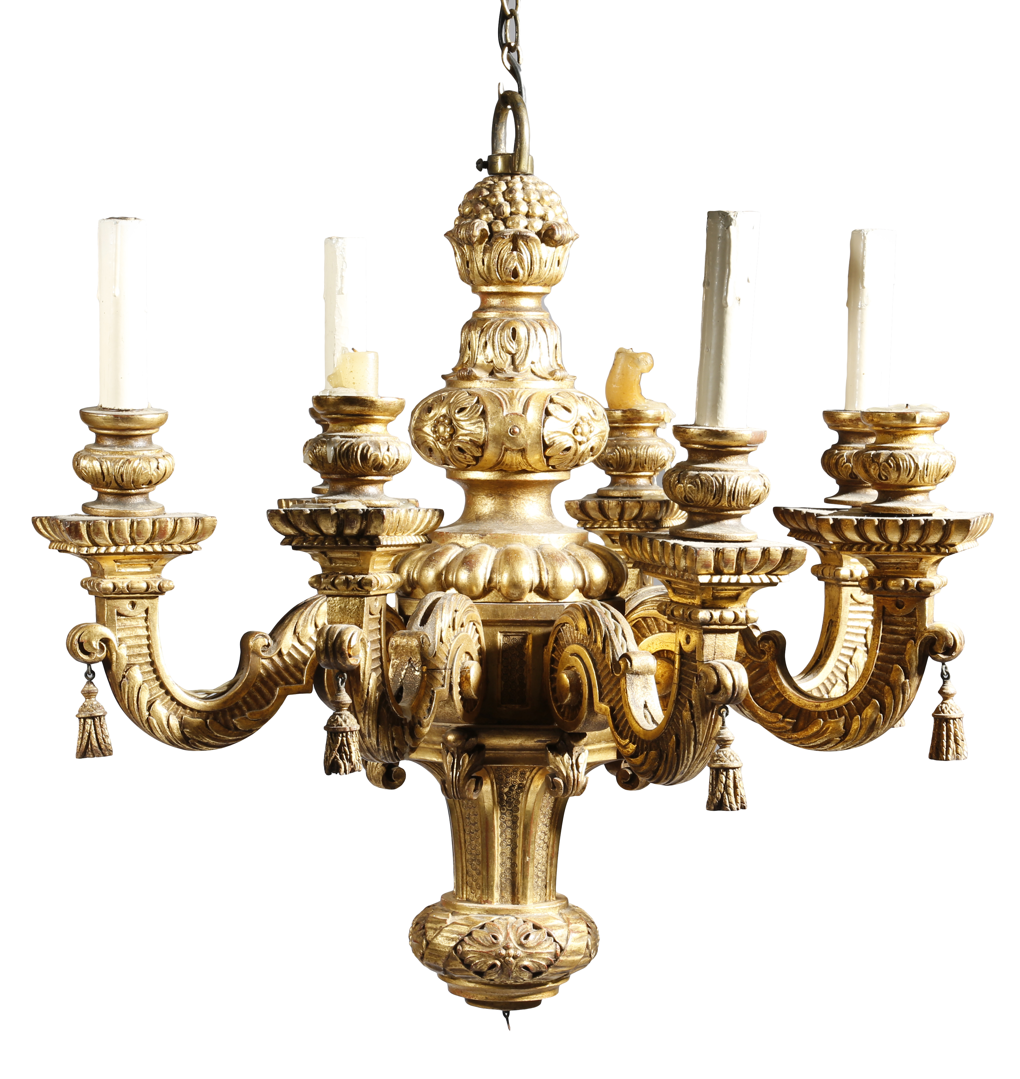 A carved giltwood eight-light chandelier in George II style, with a bud finial, above a stem carved with leaves, flowers and punched ground panels, with leaf scroll arms hung with tassels, late 19th / early 20th century, 62.5cm high, 58.7cm wide.