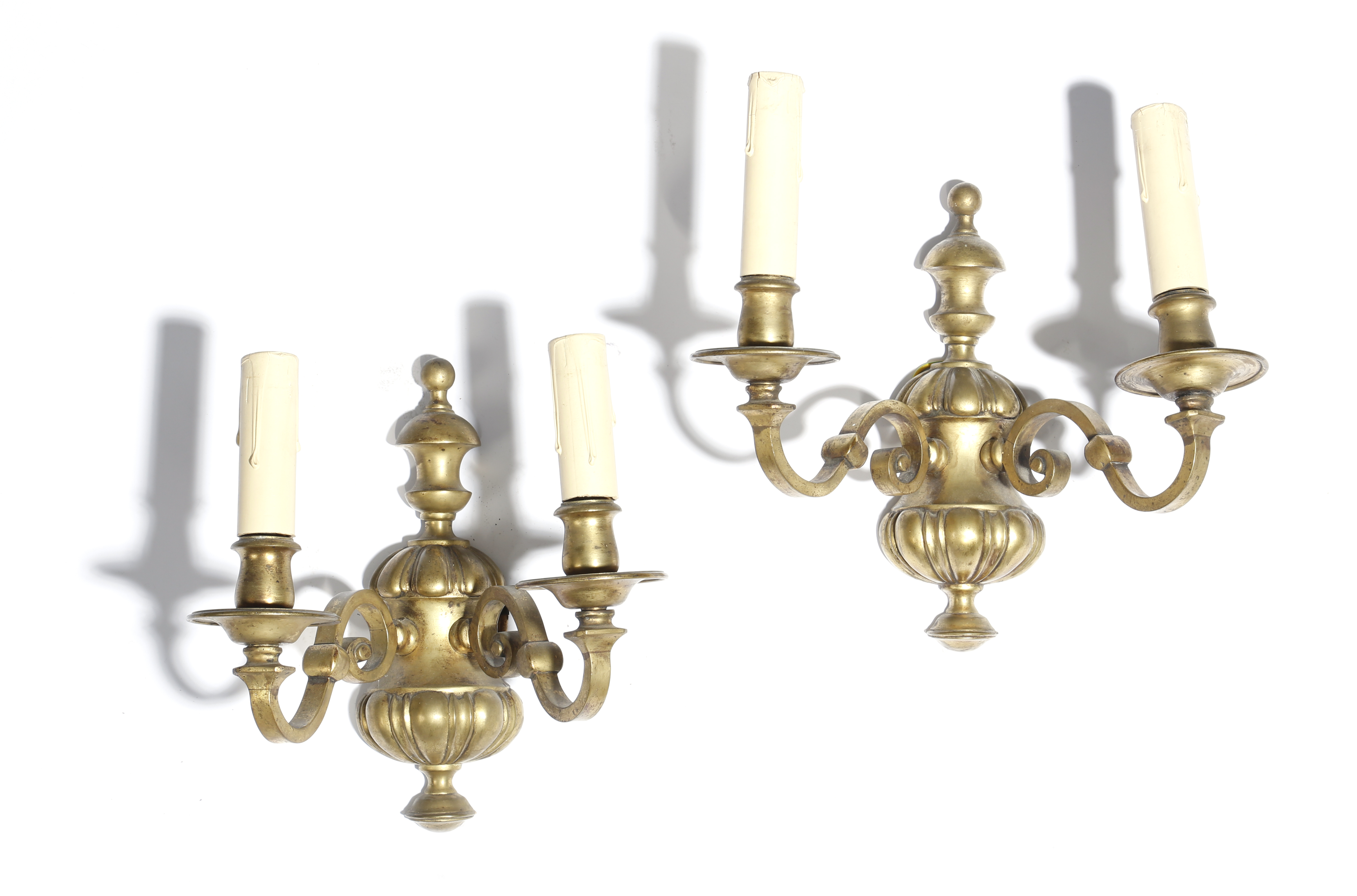 A set of six brass wall lights in George II style, each with an urn and lobed baluster backplate, issuing twin scroll arms with dished drip-pans and vase turned nozzles, 27cm high, 29.7cm wide. (6)