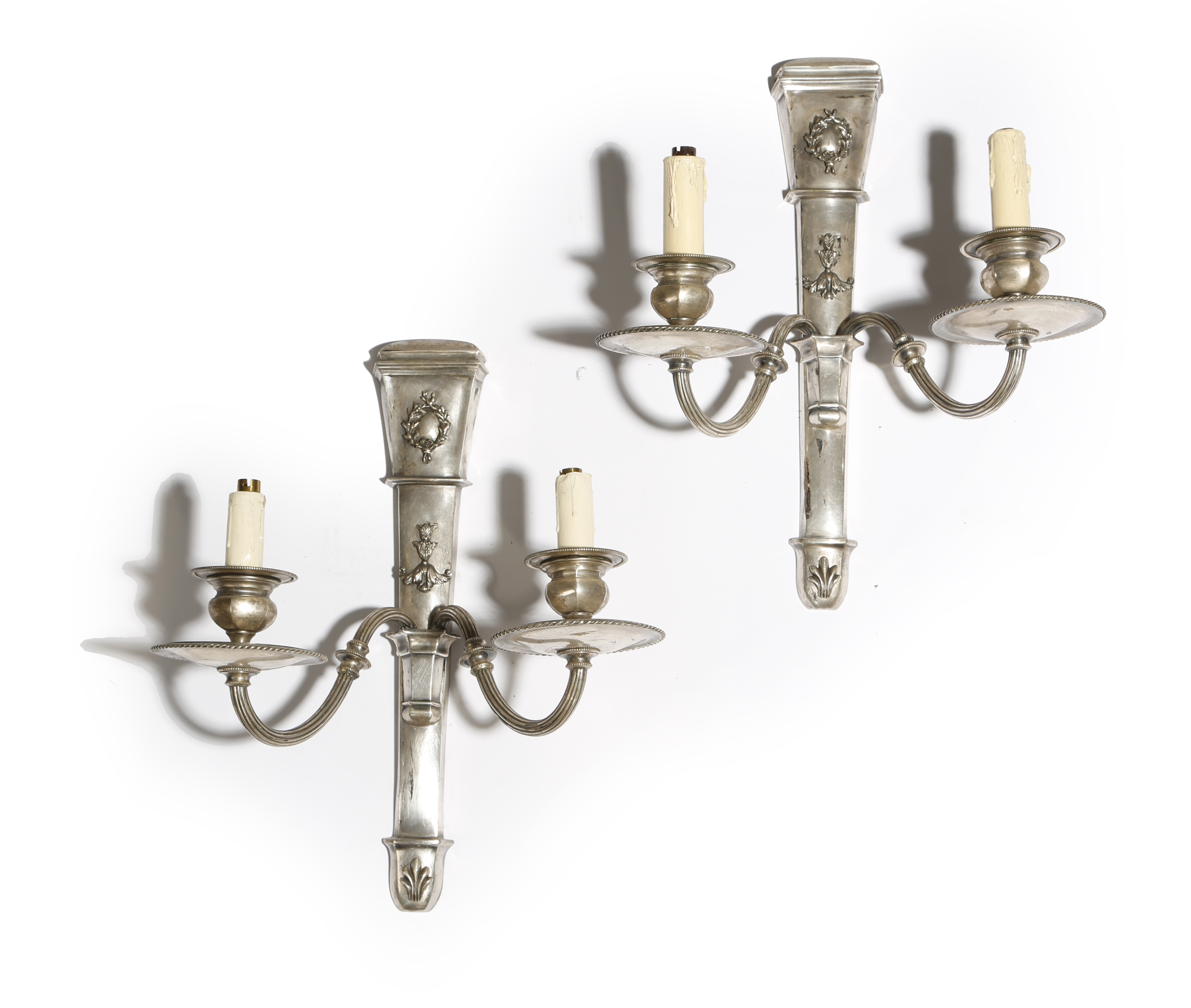 A pair of silvered wall lights in George III style, each with a tapering back plate decorated with a laurel wreath above leaves, with a pair of reeded scroll branches and faceted urn sconces, late 19th / early 20th century, 46.2cm high, 38cm wide. (2)