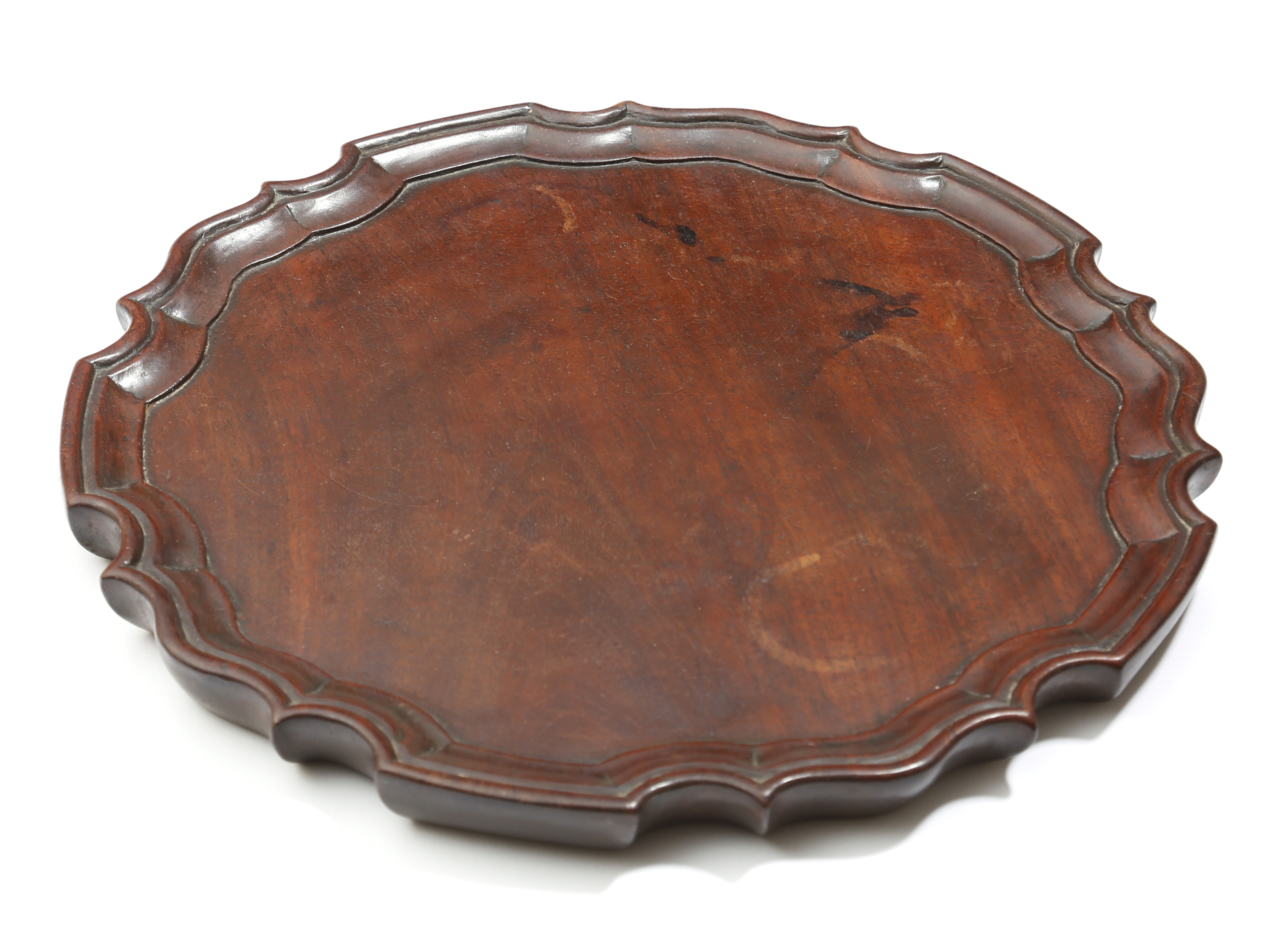 A small George III mahogany tray, with a moulded pie-crust edge, 27.5cm wide.