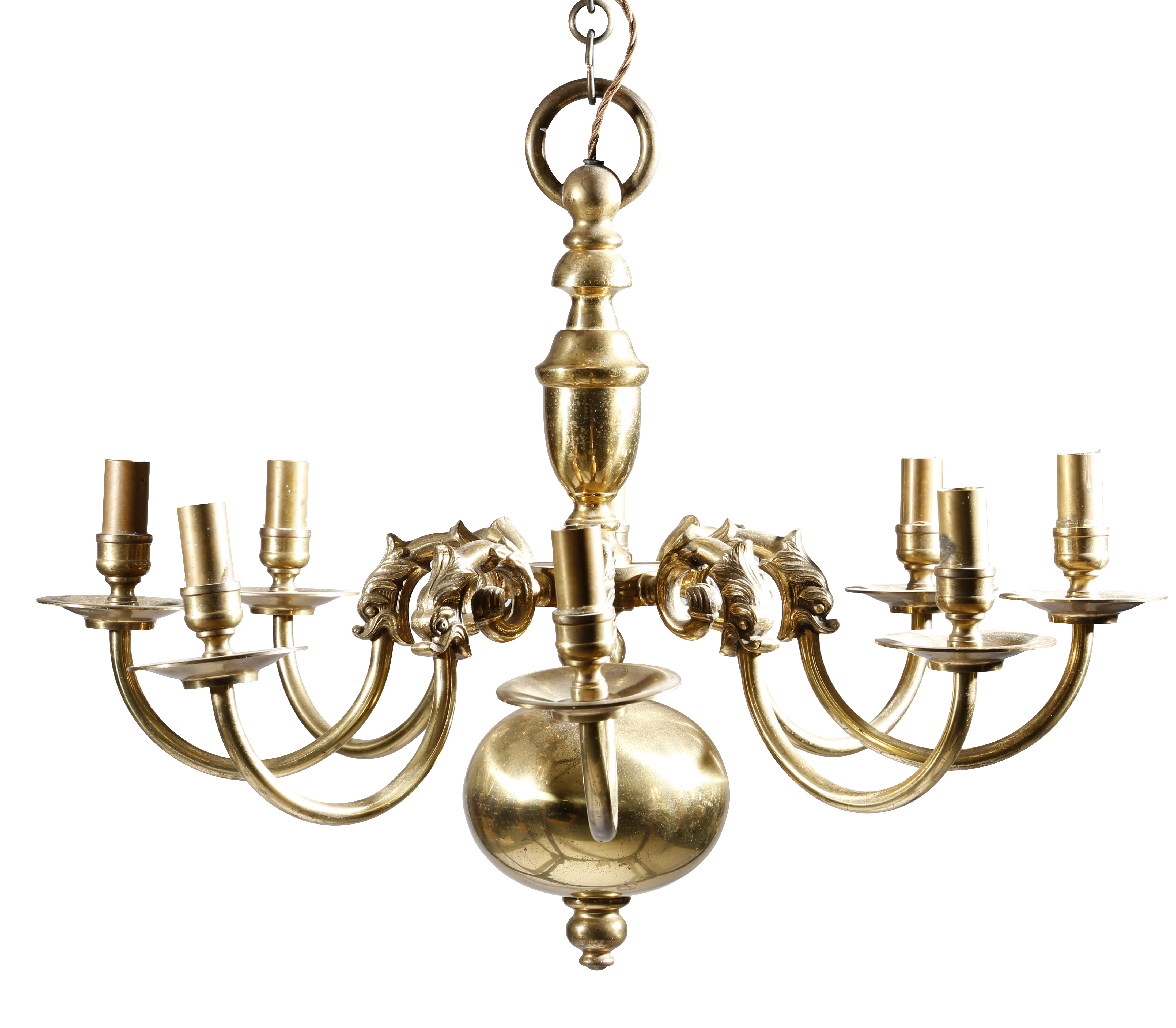 A pair of Dutch gilt brass eight-light chandeliers in 18th century style, each with a baluster stem and with scroll branches with beast terminals and a ball pendant, 51.8cm high, 65cm wide. (2)