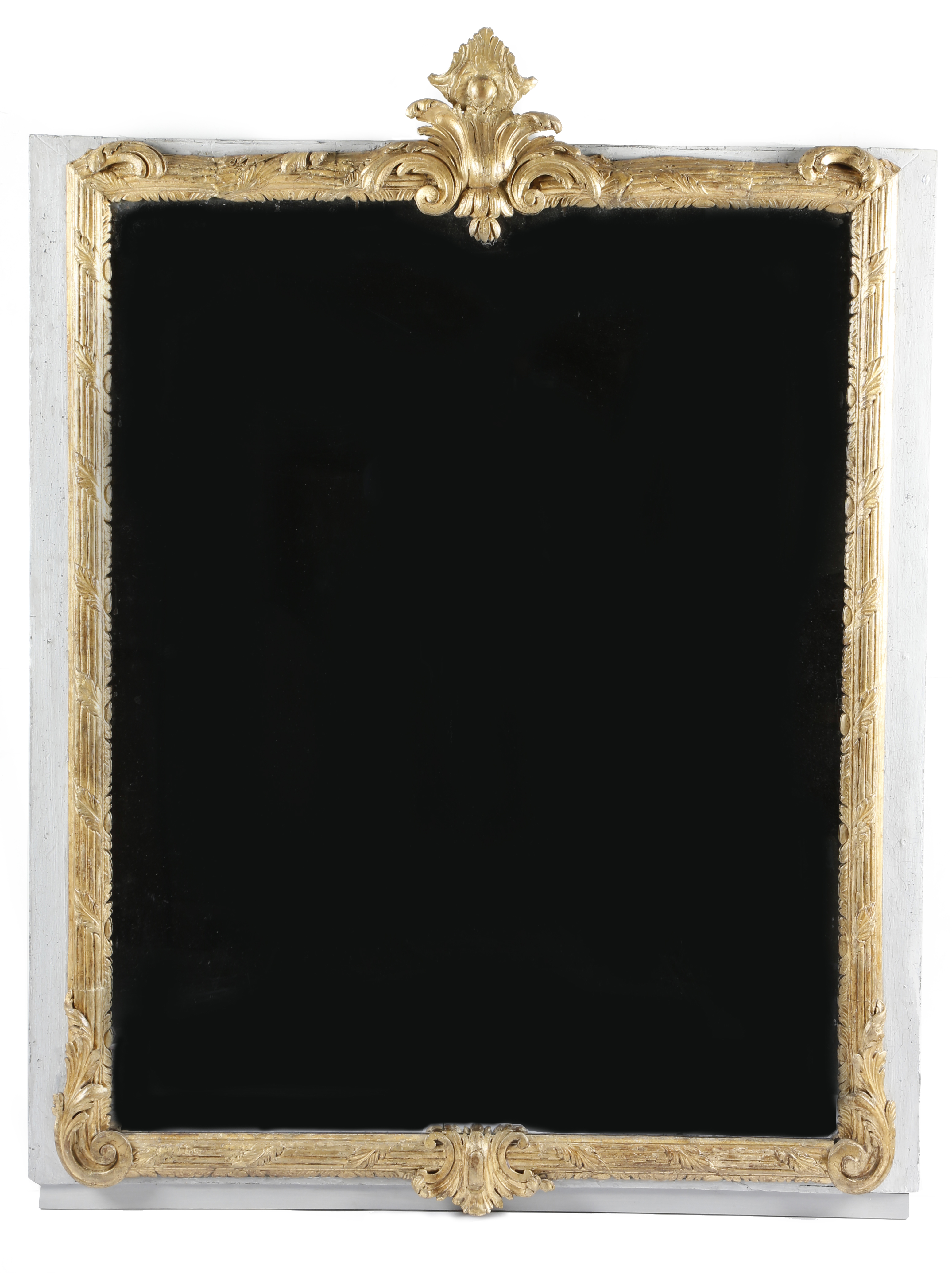 An 18th century French gilt and painted wood wall mirror, the later rectangular plate within a reeded and leaf carved frame, with a panelled back, 128.6 x 108.2cm.