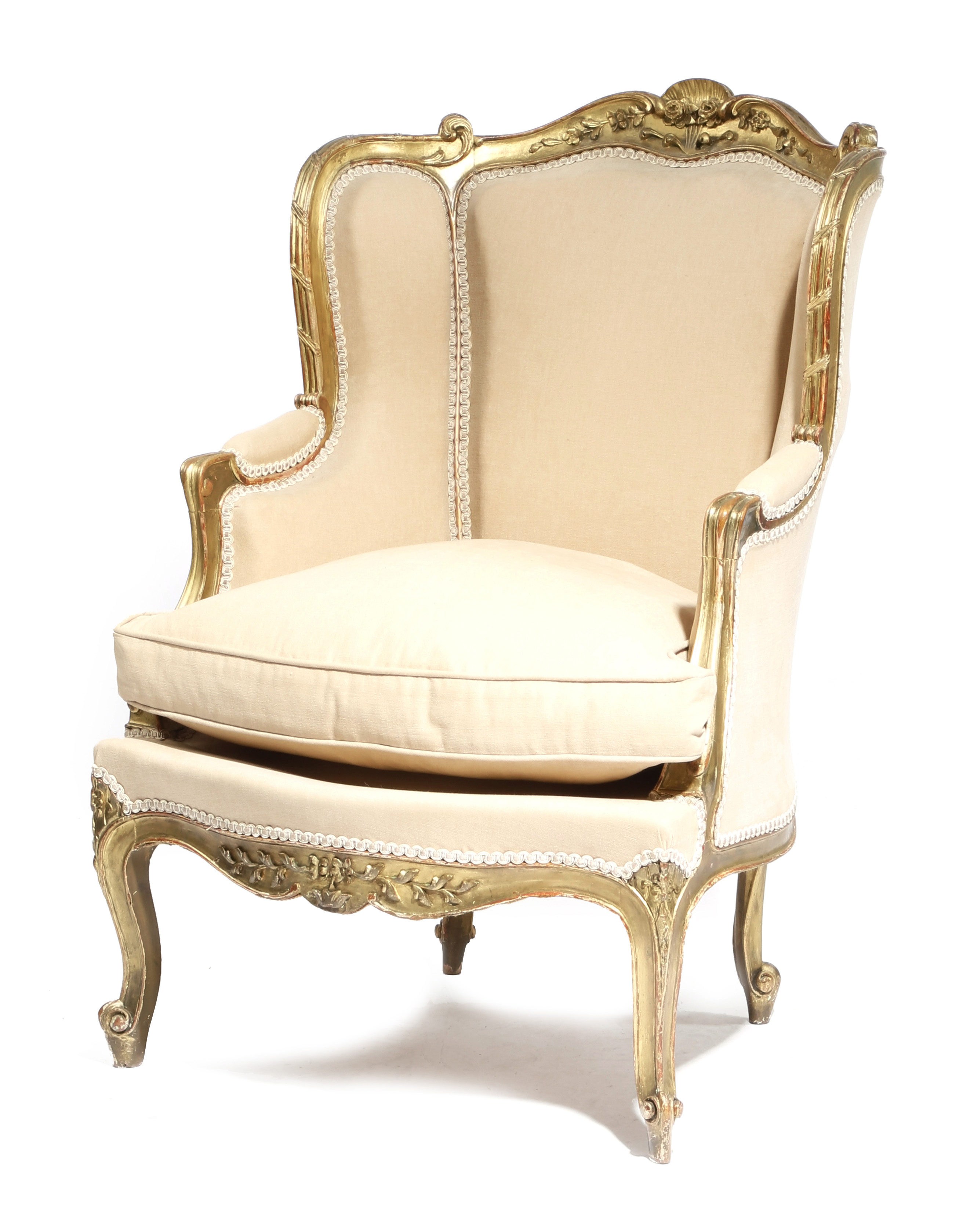 A French giltwood bergère armchair in Louis XV style, the frame carved with leaves and flowers, the serpentine front on cabriole legs, late 19th / early 20th century.