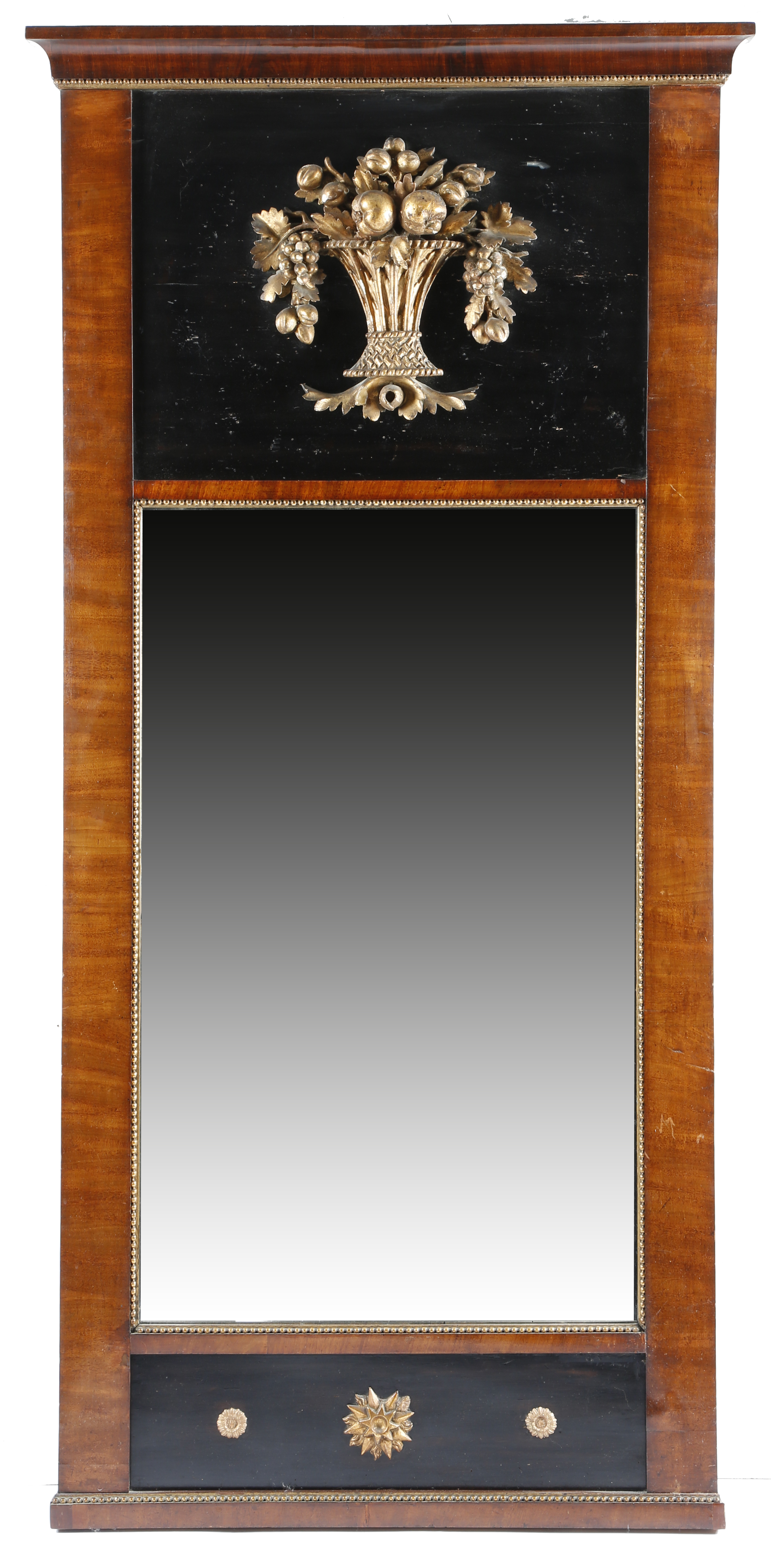 A 19th century German mahogany and giltwood wall mirror, the rectangular plate within a beaded slip surmounted by an ebonised panel, applied with a basket of fruit, possibly German, 155.7 x 75cm.