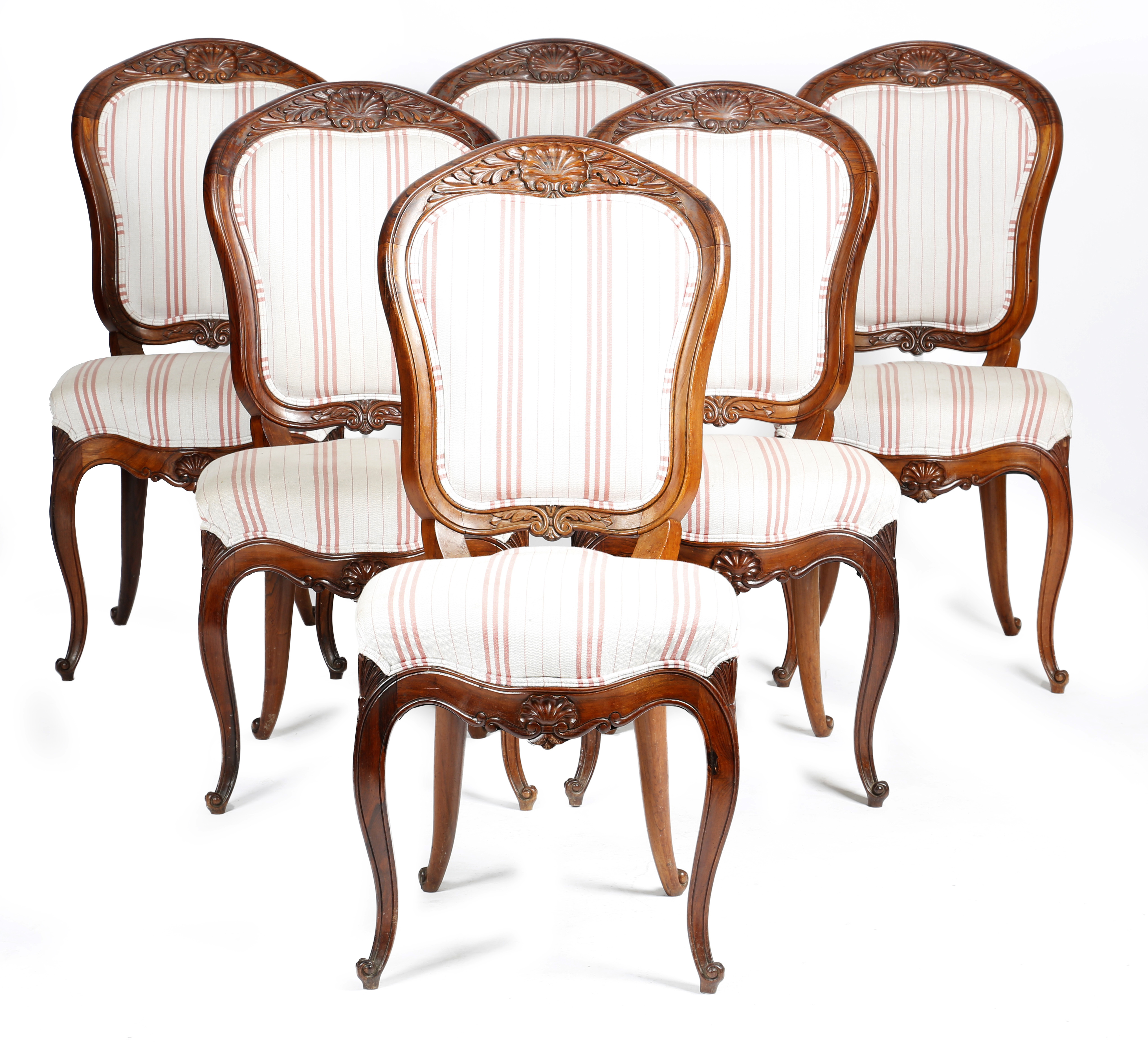 λ A set of six 19th century rosewood dining chairs, each with a cartouche shape back carved with a shell and leaves, upholstered with striped fabric, on cabriole legs. (6)