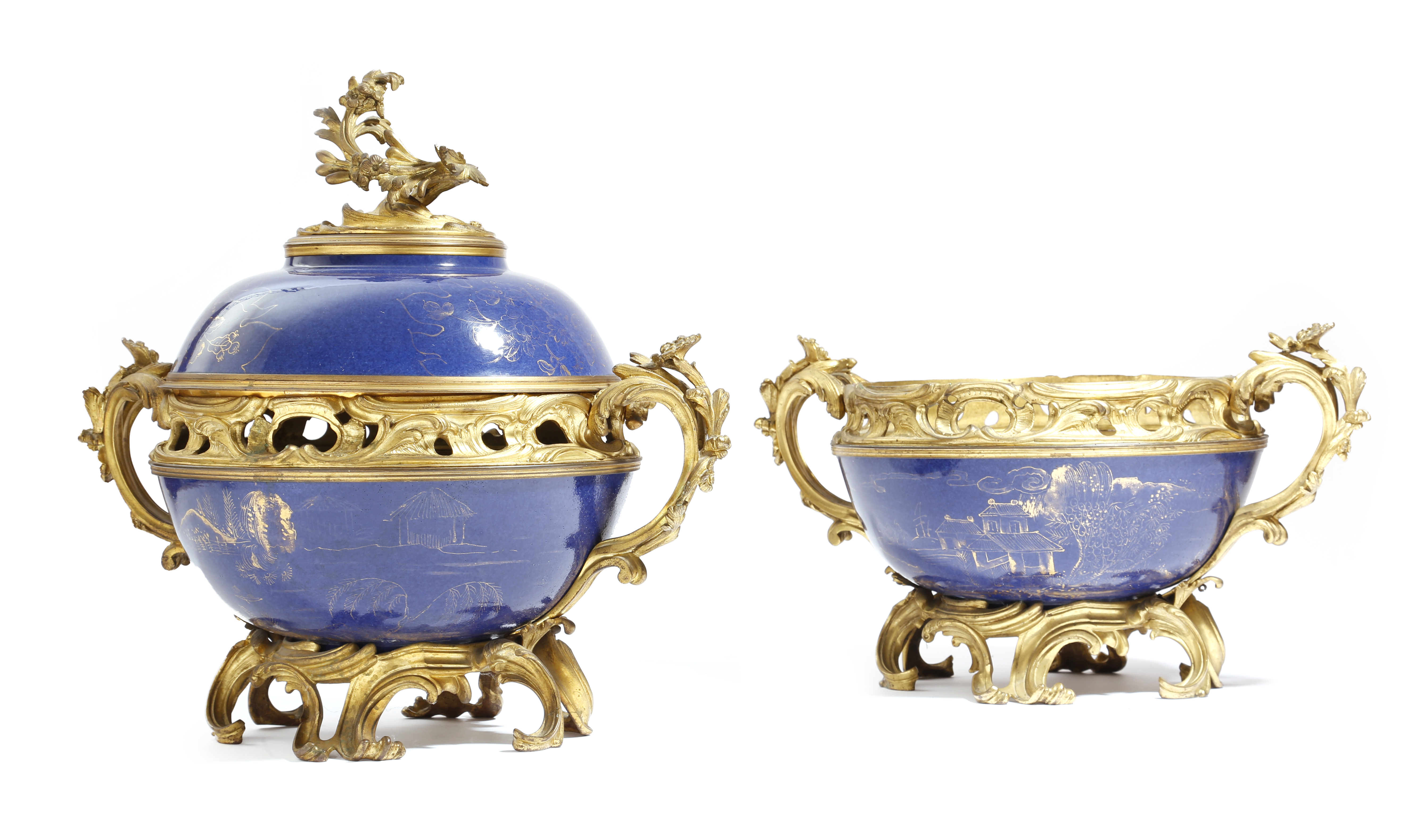 A pair of Napoleon III ormolu mounted porcelain pot pourri bowls in Louis XV style, one with a cover, the powder blue Paris porcelain bodies decorated in gilt in Chinese Kangxi style, the Rococo mounts with scrolls, leaves, flowers and rocaille, one with a printed paper label, inscribed 'LORD ASTOR OF HEVER', 36.5cm high (max). (2)