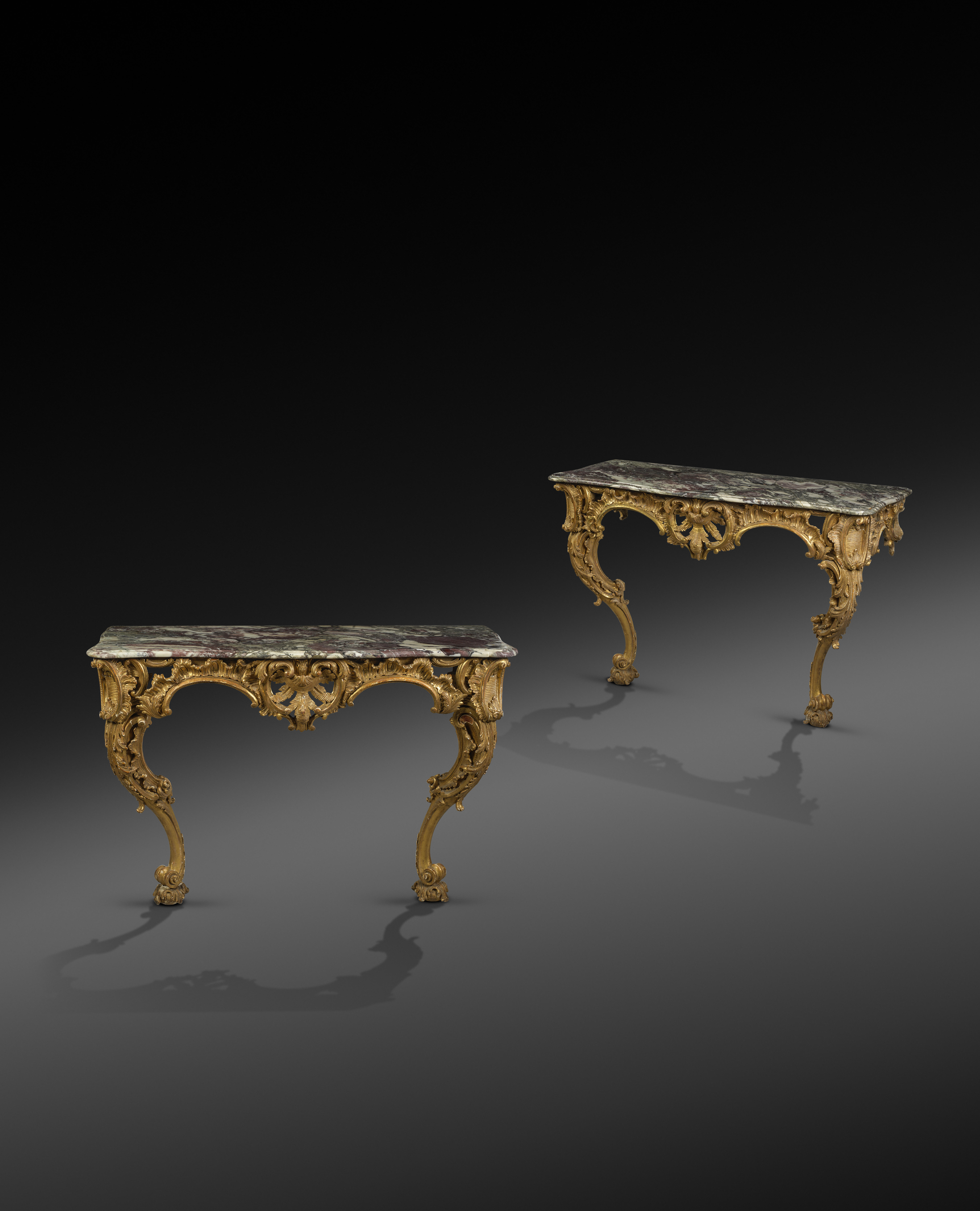 A pair of Italian Rococo giltwood console tables, each with a serpentine brèche violet marble top with a moulded edge, above a pierced scroll rocaille and leaf decorated frieze, with 'C' scroll and acanthus cabriole legs, on leaf wrapped ball feet, late 18th / early 19th century, 87cm high, 131cm wide, 54.2cm deep. (2)